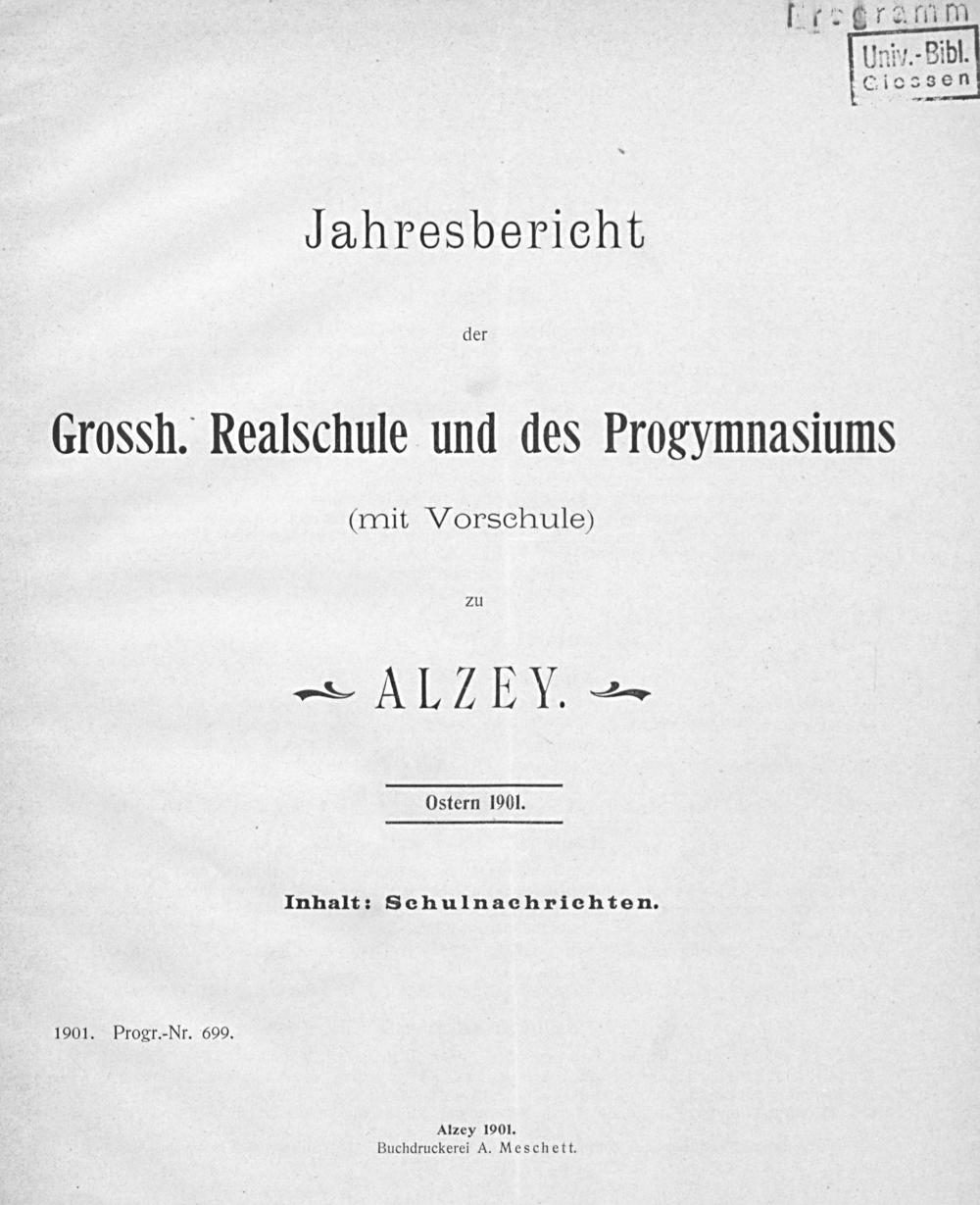 Jahresbericht der Grossh. Realschule und des Progymnasiums (mit Vorschule) zu Alzey
