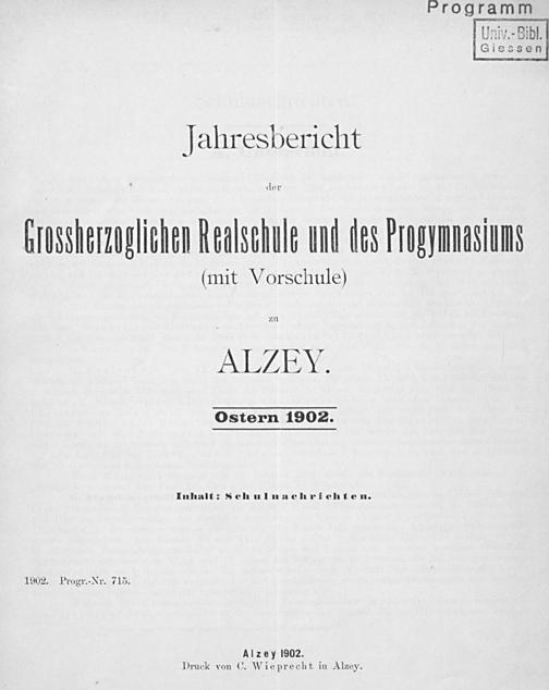 Jahresbericht der Grossh. Realschule und des Progymnasiums (mit Vorschule) zu Alzey