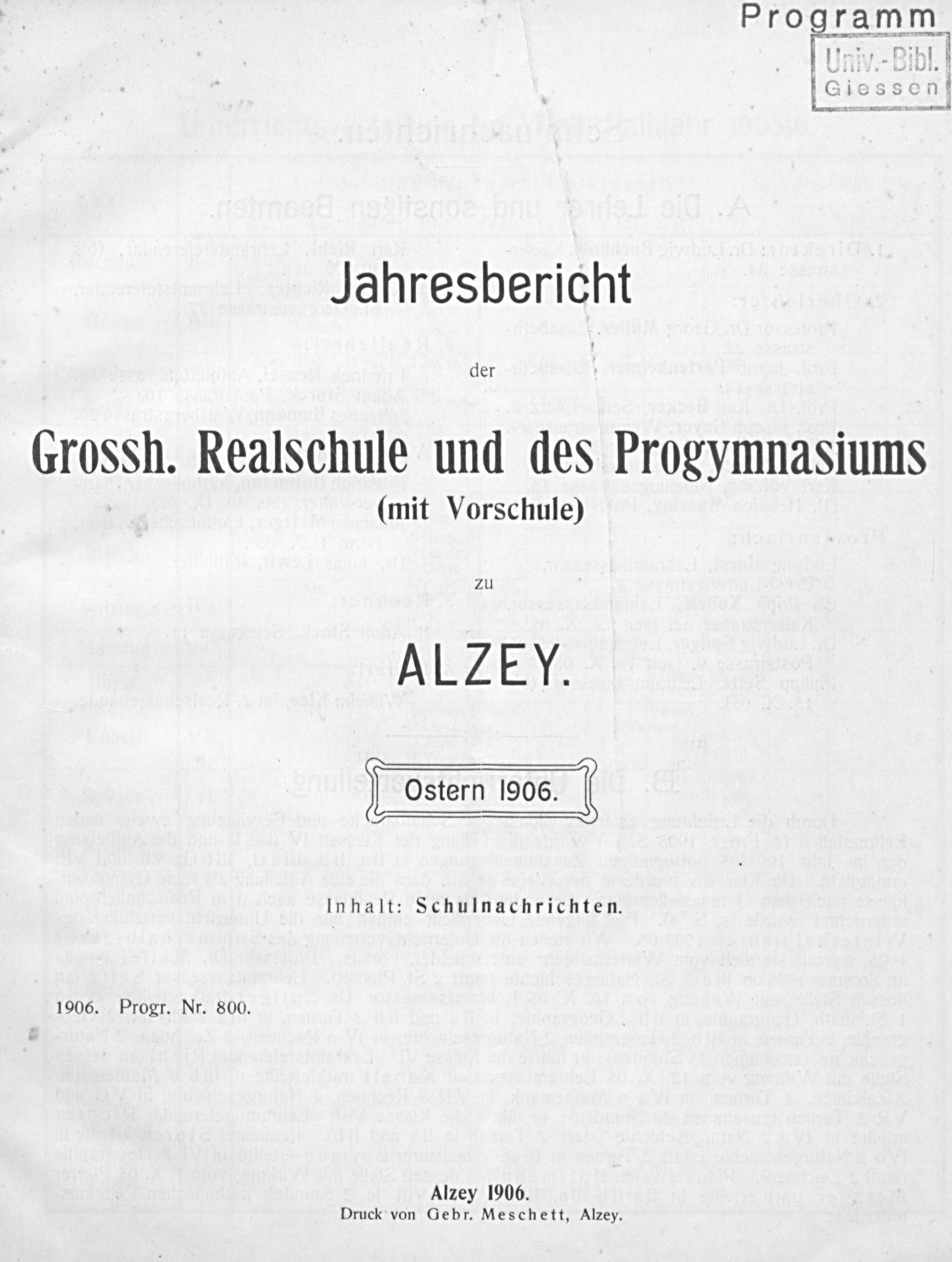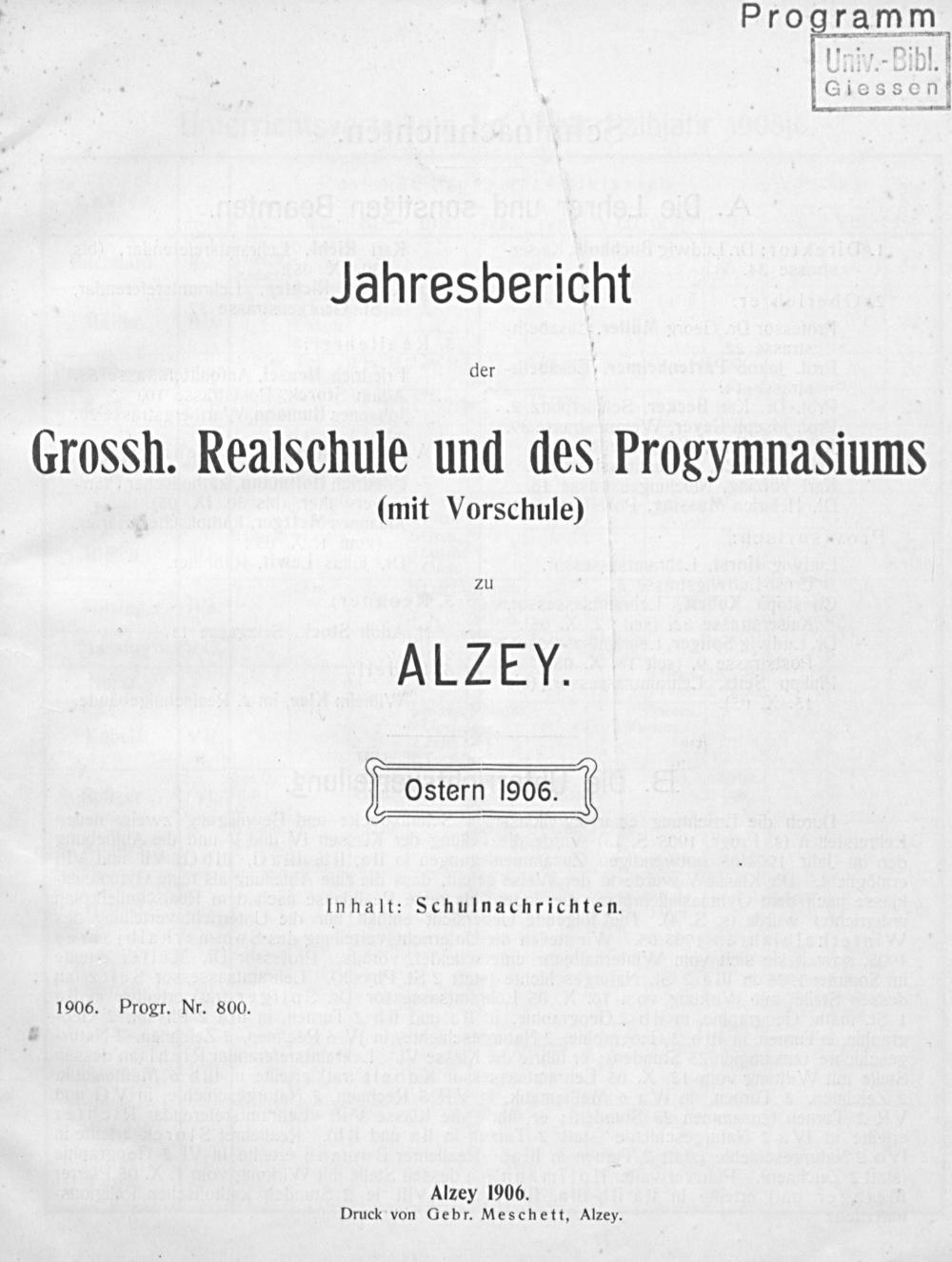 Jahresbericht der Grossh. Realschule und des Progymnasiums (mit Vorschule) zu Alzey
