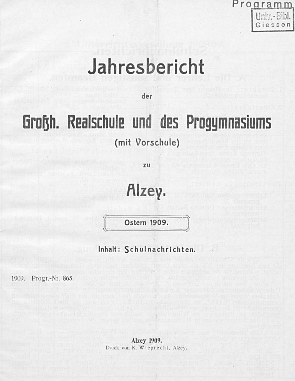 Jahresbericht der Grossh. Realschule und des Progymnasiums (mit Vorschule) zu Alzey