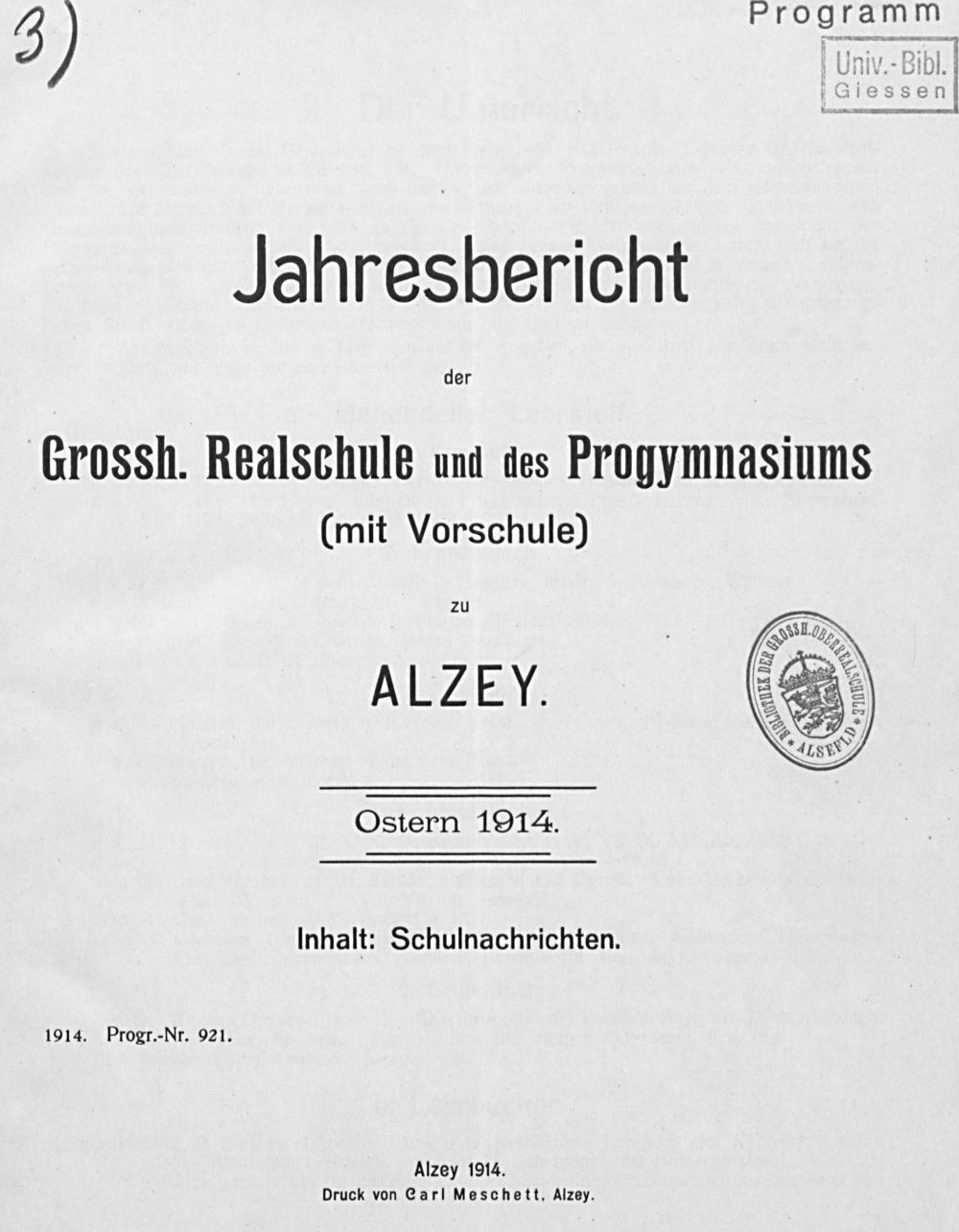 Jahresbericht der Grossh. Realschule und des Progymnasiums (mit Vorschule) zu Alzey