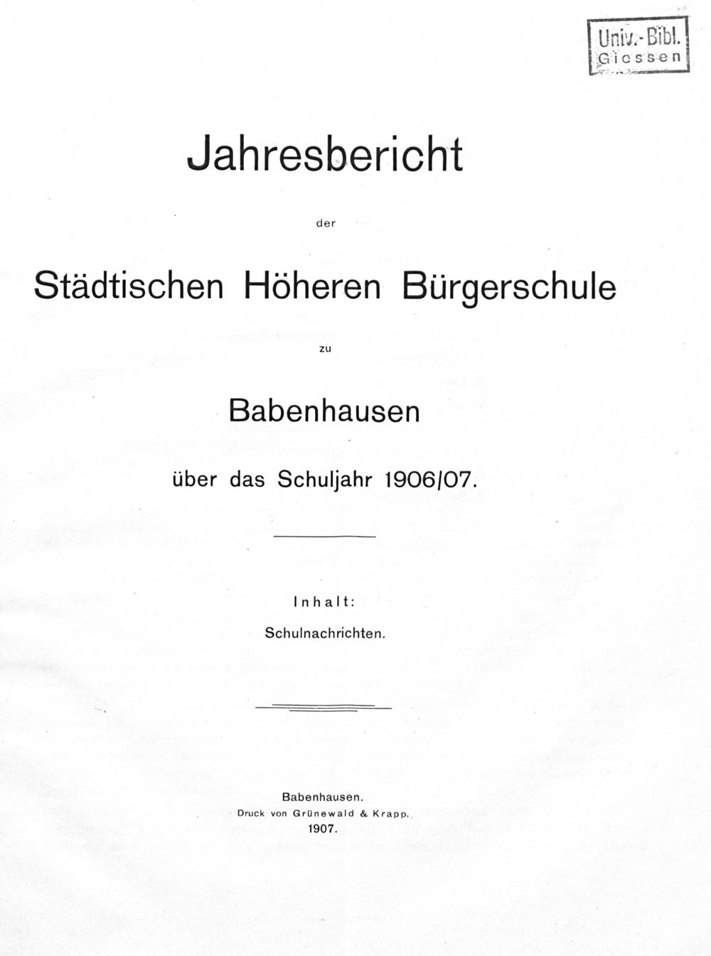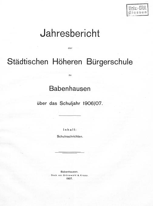 Jahresbericht der Städtischen Höheren Bürgerschule zu Babenhausen über das Schuljahr ...