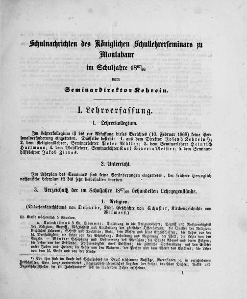 Programm, durch welches zu den öffentlichen Prüfungen der Zöglinge des Königlichen Schullehrer-Seminars zu Montabaur am ..., des Königlichen Schullehrerseminars zu Usingen am ..., des Königlichen Taubstummen-Instituts zu Camberg am ..., die Eltern und Vormünder der Zöglinge, sowie alle Freunde des Schulwesens geziemend eingeladen werden