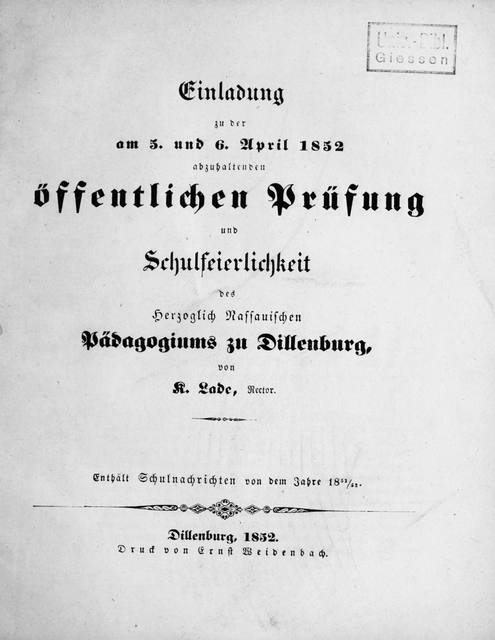 Einladung zu der am ... abzuhaltenden öffentlichen Prüfung und Schulfeierlichkeit des Herzoglich-Nassauischen Pädagogiums zu Dillenburg