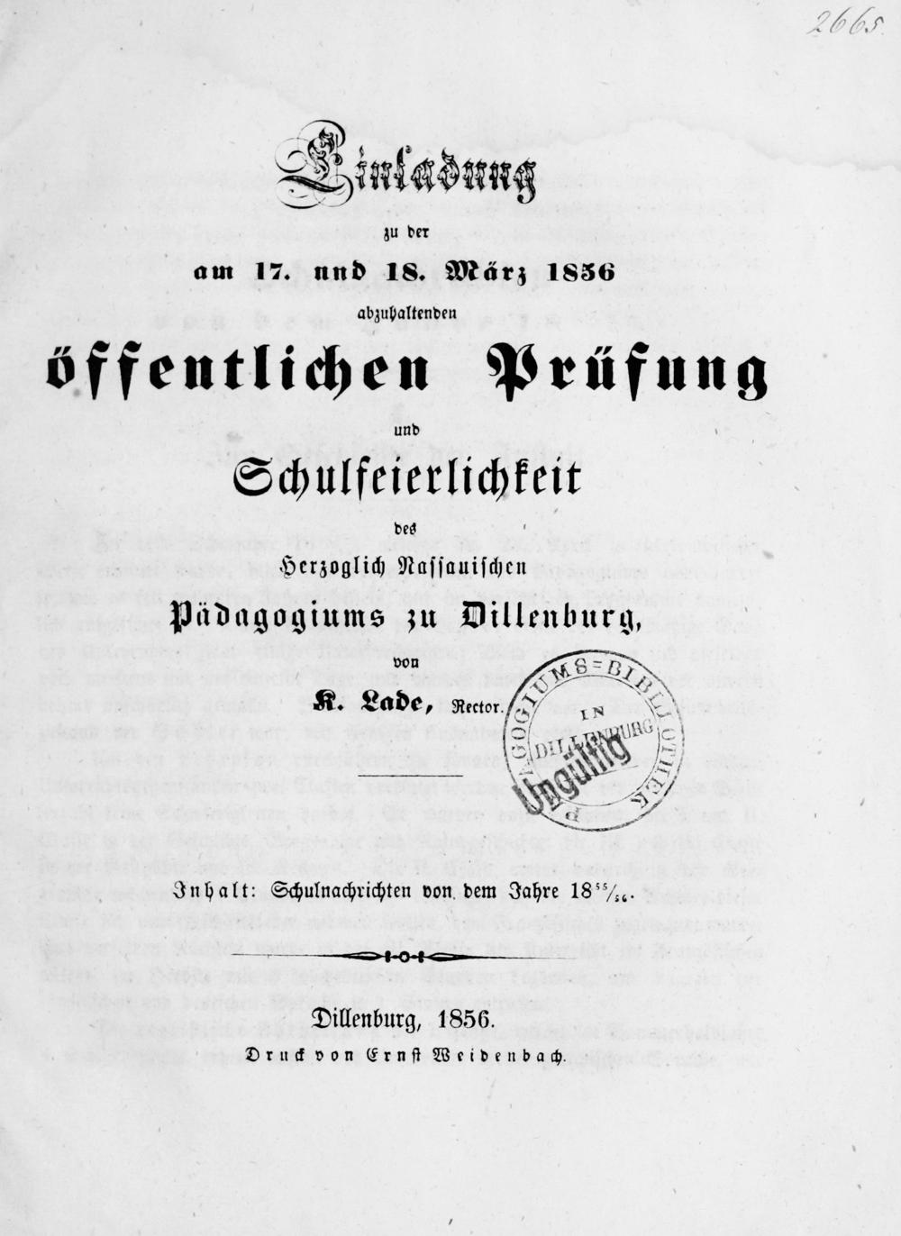 Einladung zu der am ... abzuhaltenden öffentlichen Prüfung und Schulfeierlichkeit des Herzoglich-Nassauischen Pädagogiums zu Dillenburg