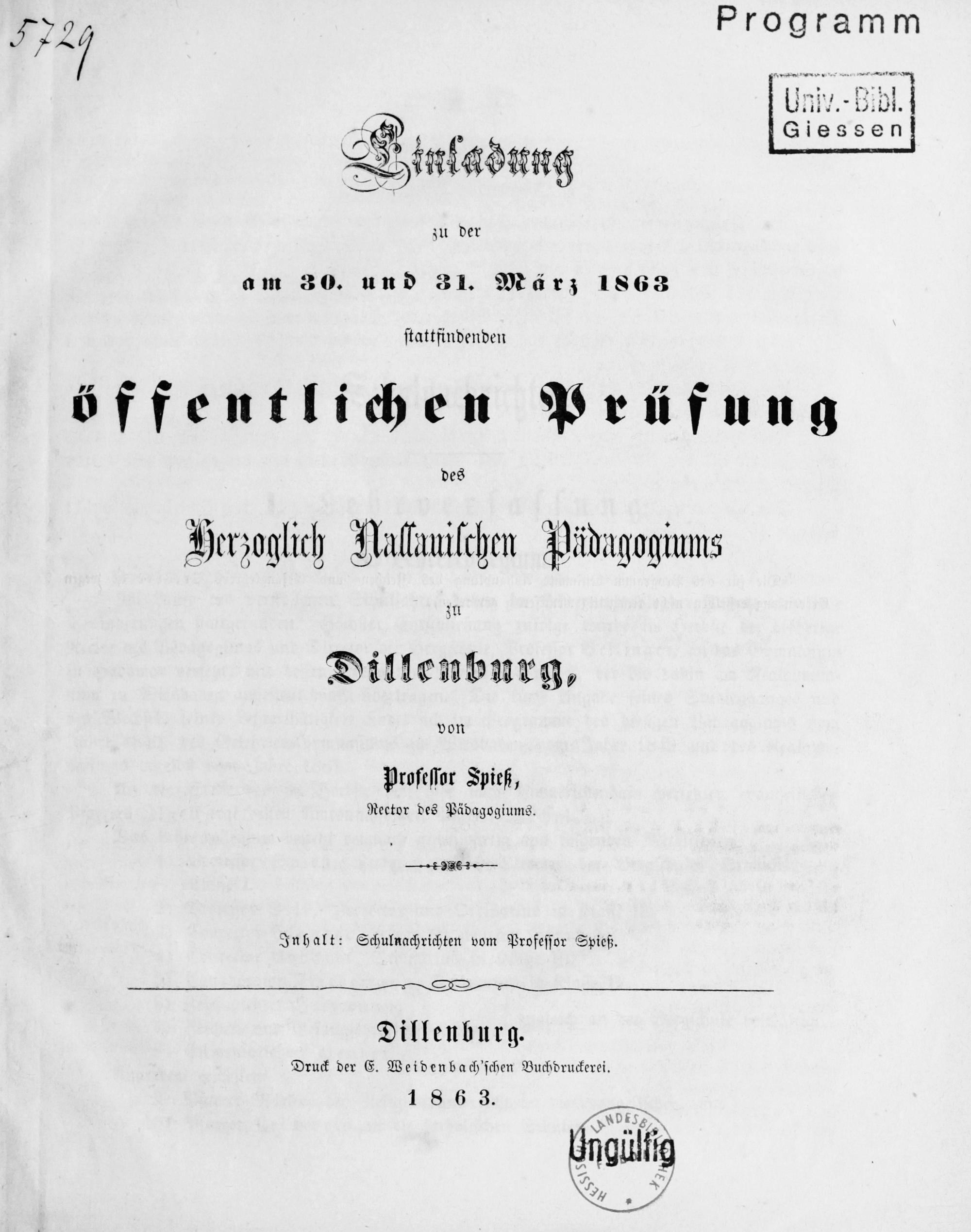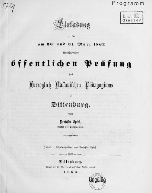 Einladung zu der am ... stattfindenden öffentlichen Prüfung des Herzoglich-Nassauischen Pädagogiums zu Dillenburg
