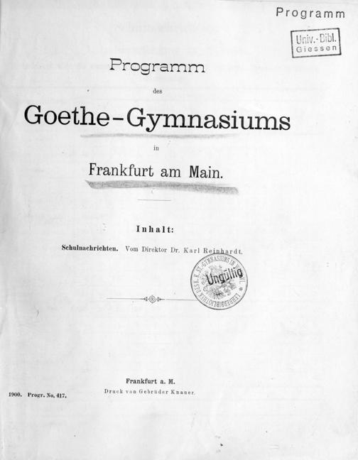 Festschrift zu der am 7. Januar 1897 stattfindenden Einweihung des Goethe-Gymnasiums in Frankfurt/M., hrsg. v. Lehrerkollegium