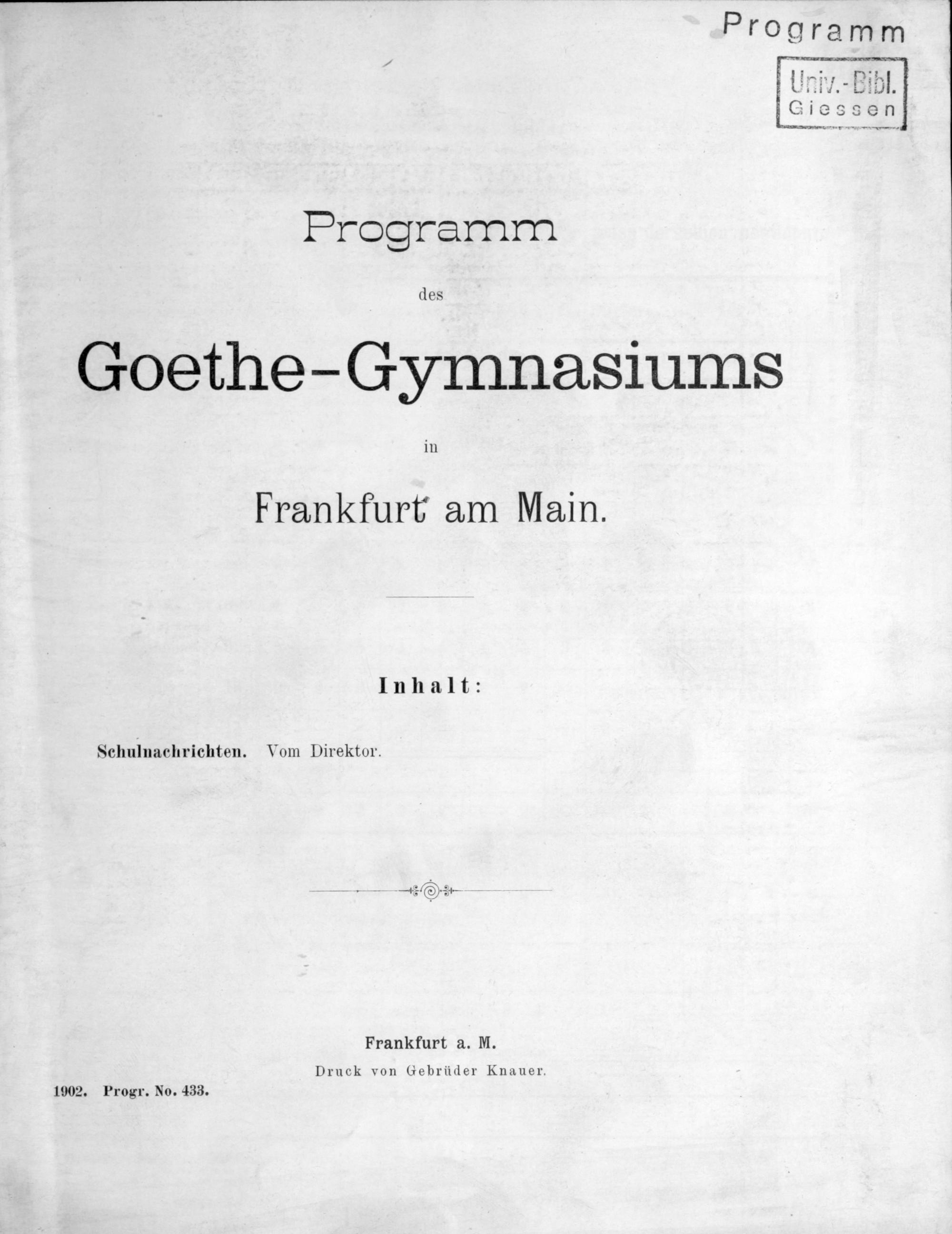 Festschrift zu der am 7. Januar 1897 stattfindenden Einweihung des Goethe-Gymnasiums in Frankfurt/M., hrsg. v. Lehrerkollegium