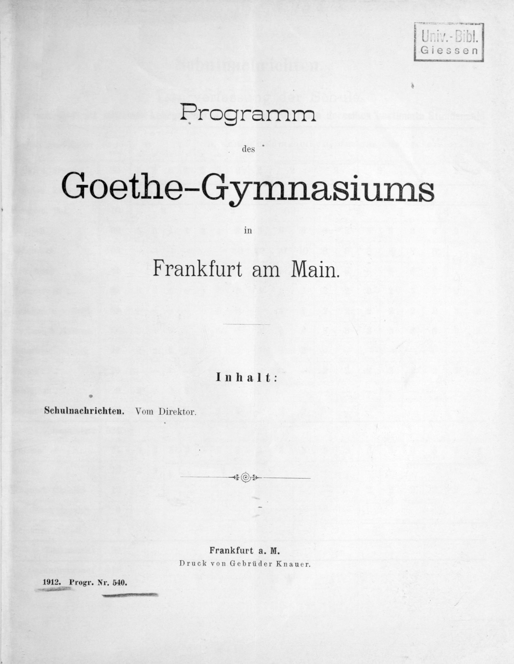 Festschrift zu der am 7. Januar 1897 stattfindenden Einweihung des Goethe-Gymnasiums in Frankfurt/M., hrsg. v. Lehrerkollegium