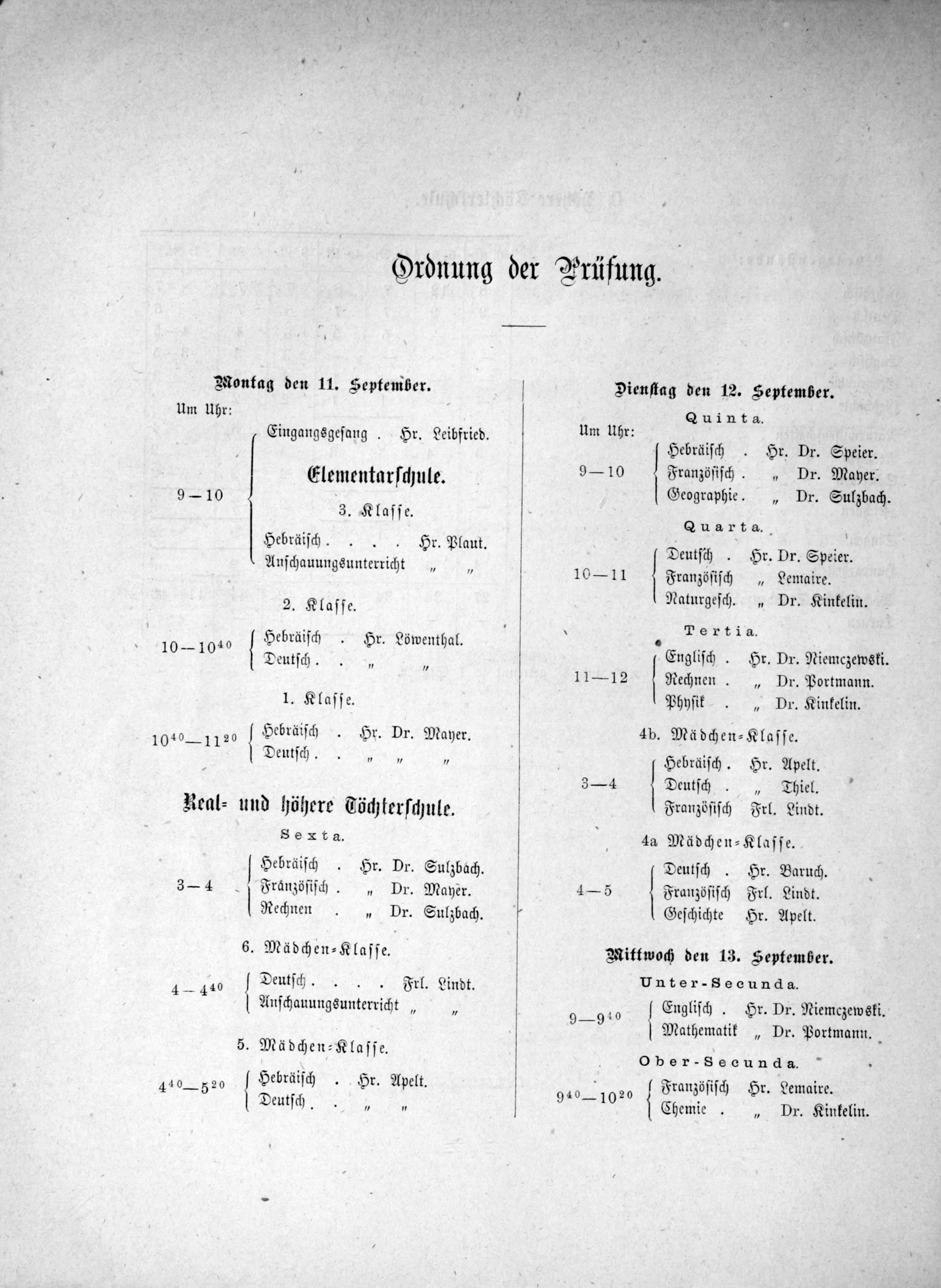 Einladungsschrift zu der öffentlichen Prüfung der Unterrichtsanstalten der Israelitischen Religions-Gesellschaft (Elementarschule, Realschule 2. O. und Höheren Töchterschule) zu Frankfurt am Main