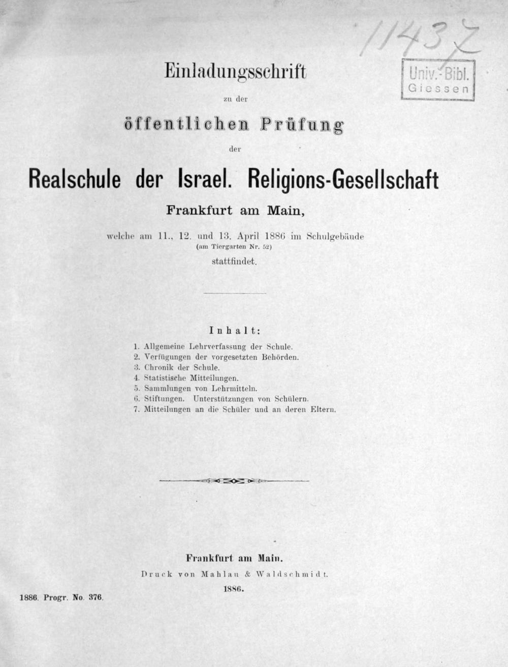 Einladungsschrift zu der öffentlichen Prüfung der Realschule der Israelitischen Religions-Gesellschaft zu Frankfurt am Main