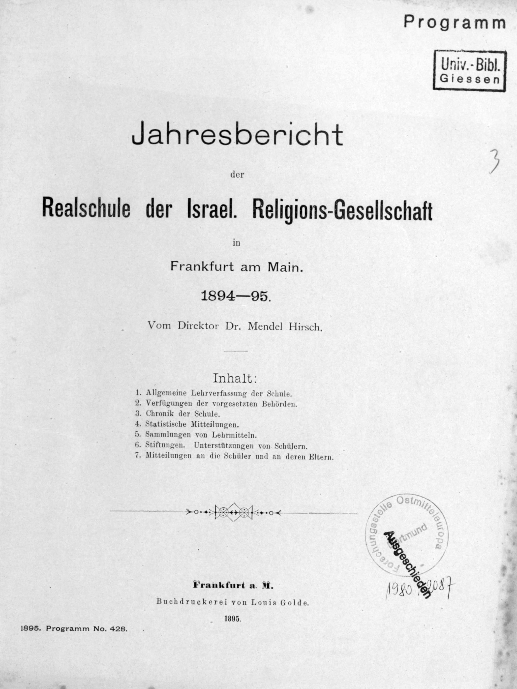 Jahresbericht der Realschule der Israelitischen Religions-Gesellschaft in Frankfurt am Main