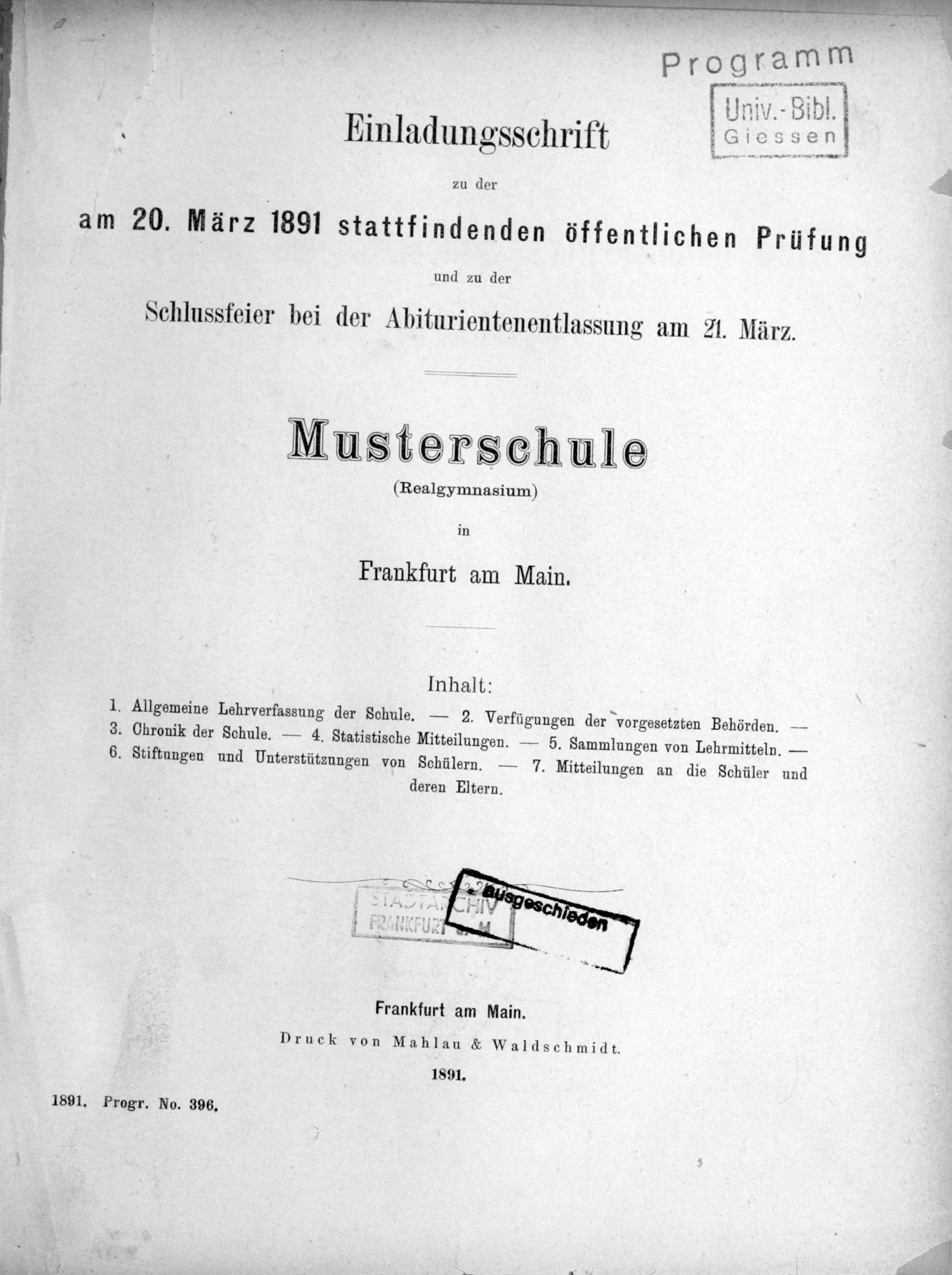 Einladungsschrift zu der ... stattfindenden öffentlichen Prüfung der Musterschule (Realgymnasium) in Frankfurt am Main
