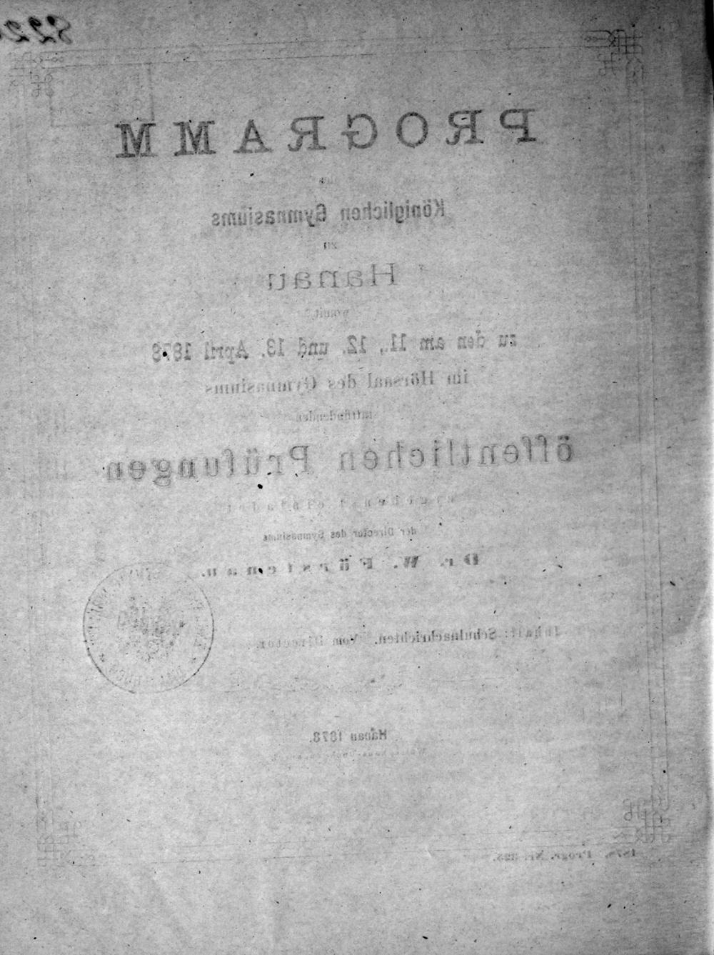 Kurze Übersicht über die Geschichte der Bibliothek des Königlichen Gymnasiums zu Hanau und Verzeichnis der alten Drucke derselben bis zur Mitte des 16. Jahrhunderts