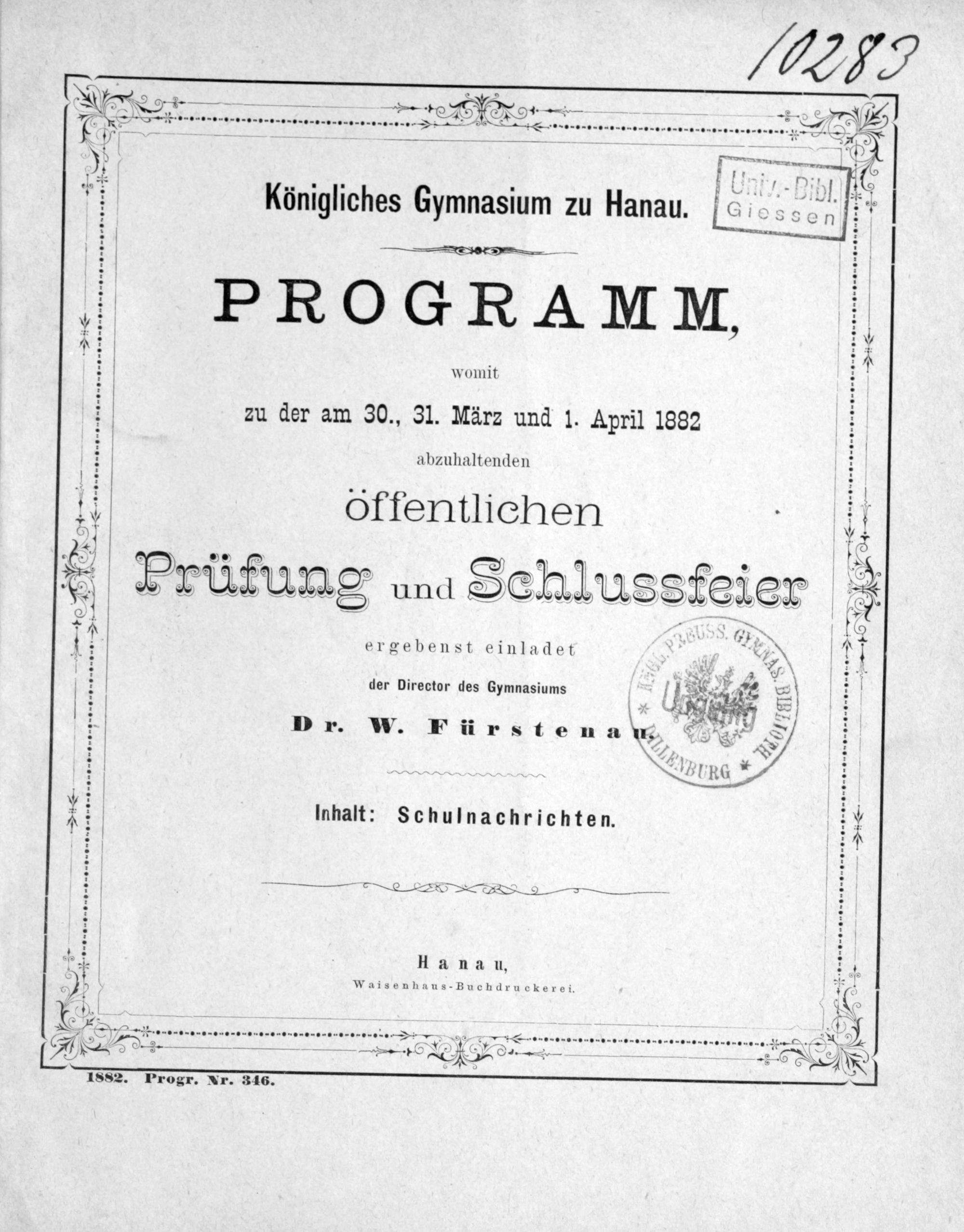 Kurze Übersicht über die Geschichte der Bibliothek des Königlichen Gymnasiums zu Hanau und Verzeichnis der alten Drucke derselben bis zur Mitte des 16. Jahrhunderts