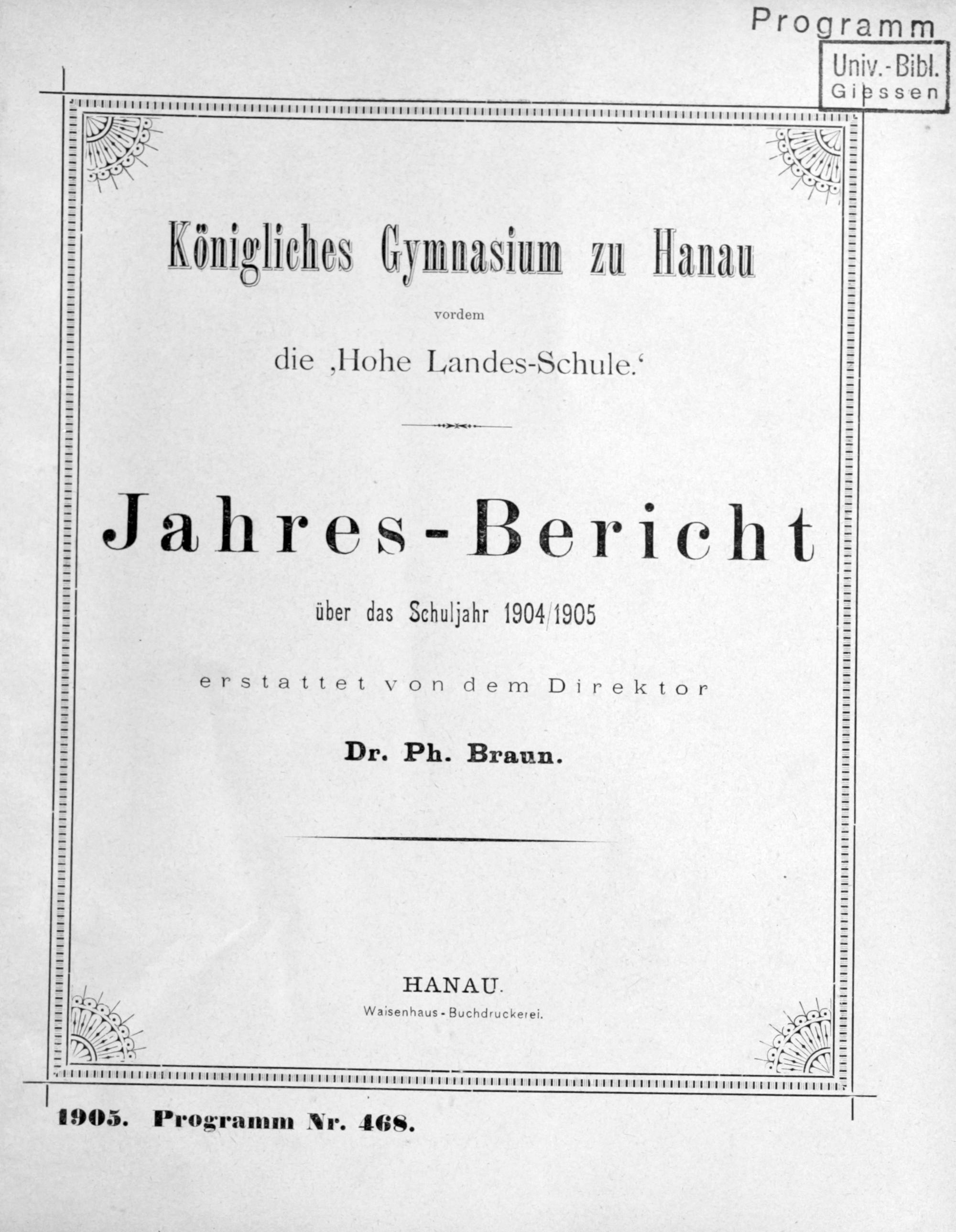Königliches Gymnasium zu Hanau, vordem "Hohe Landesschule". Festschrift zur Gedenkfeier des 300jährigen Bestehens der Anstalt. 1607-1907