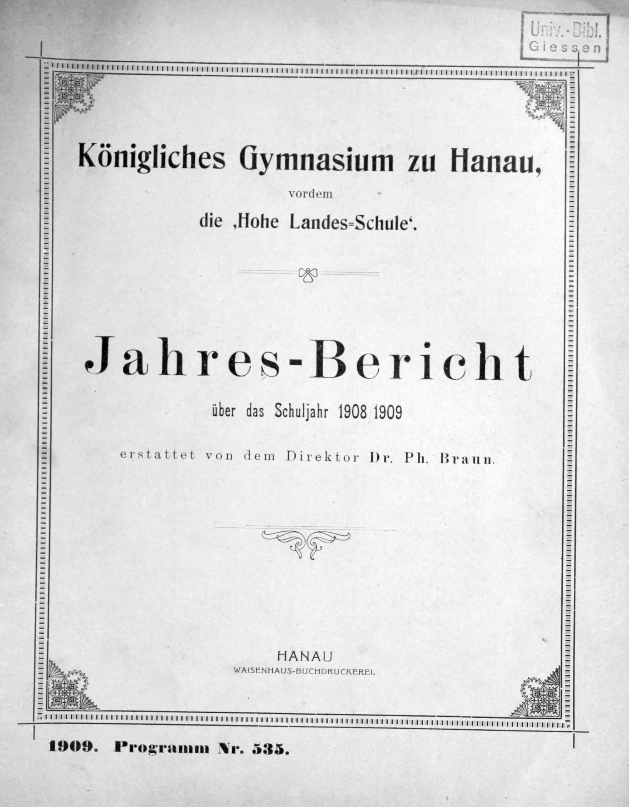 Königliches Gymnasium zu Hanau, vordem "Hohe Landesschule". Festschrift zur Gedenkfeier des 300jährigen Bestehens der Anstalt. 1607-1907