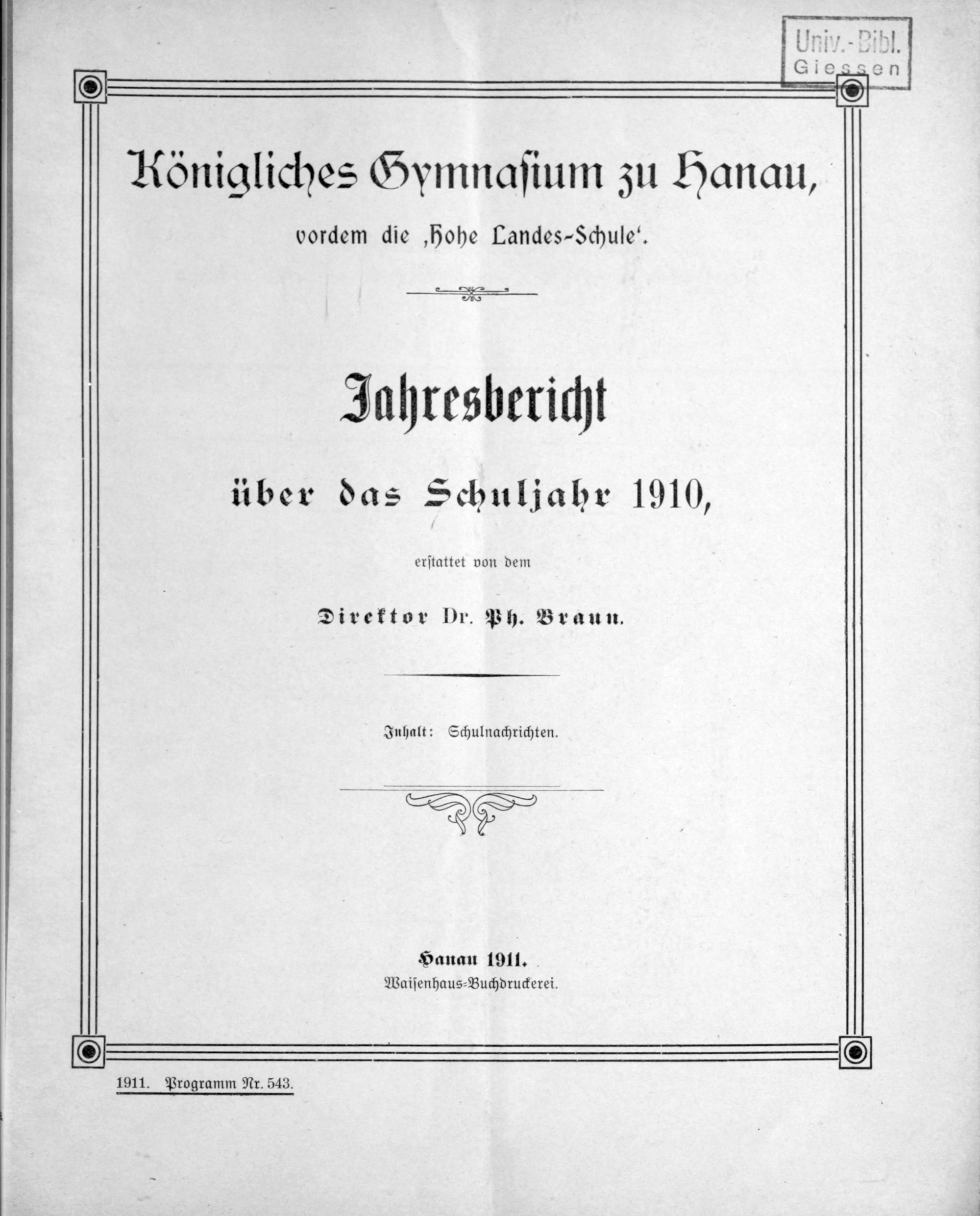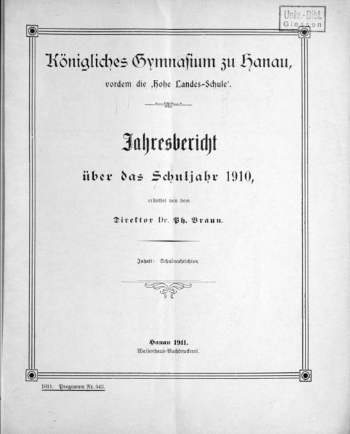 Königliches Gymnasium zu Hanau, vordem "Hohe Landesschule". Festschrift zur Gedenkfeier des 300jährigen Bestehens der Anstalt. 1607-1907