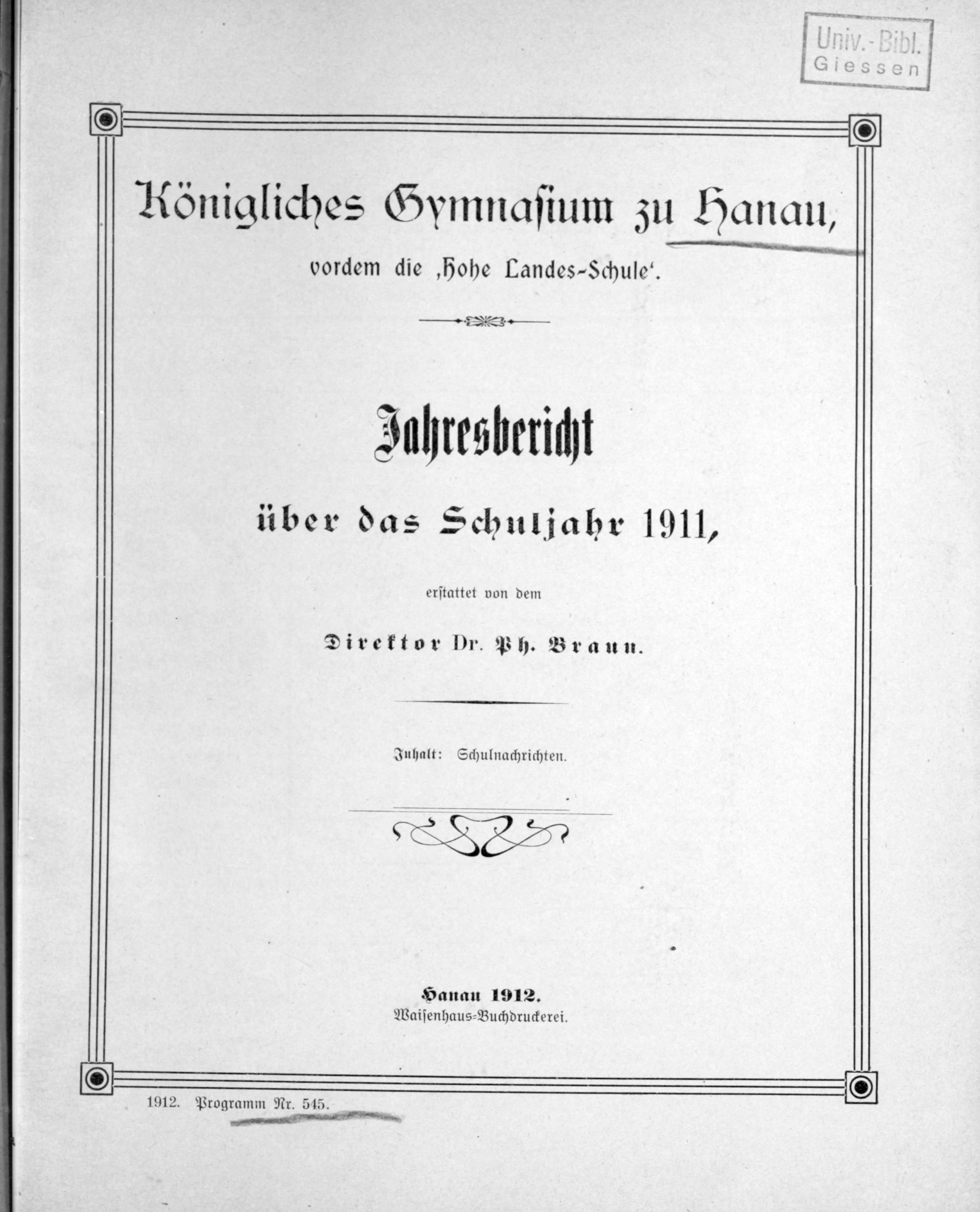 Königliches Gymnasium zu Hanau, vordem "Hohe Landesschule". Festschrift zur Gedenkfeier des 300jährigen Bestehens der Anstalt. 1607-1907