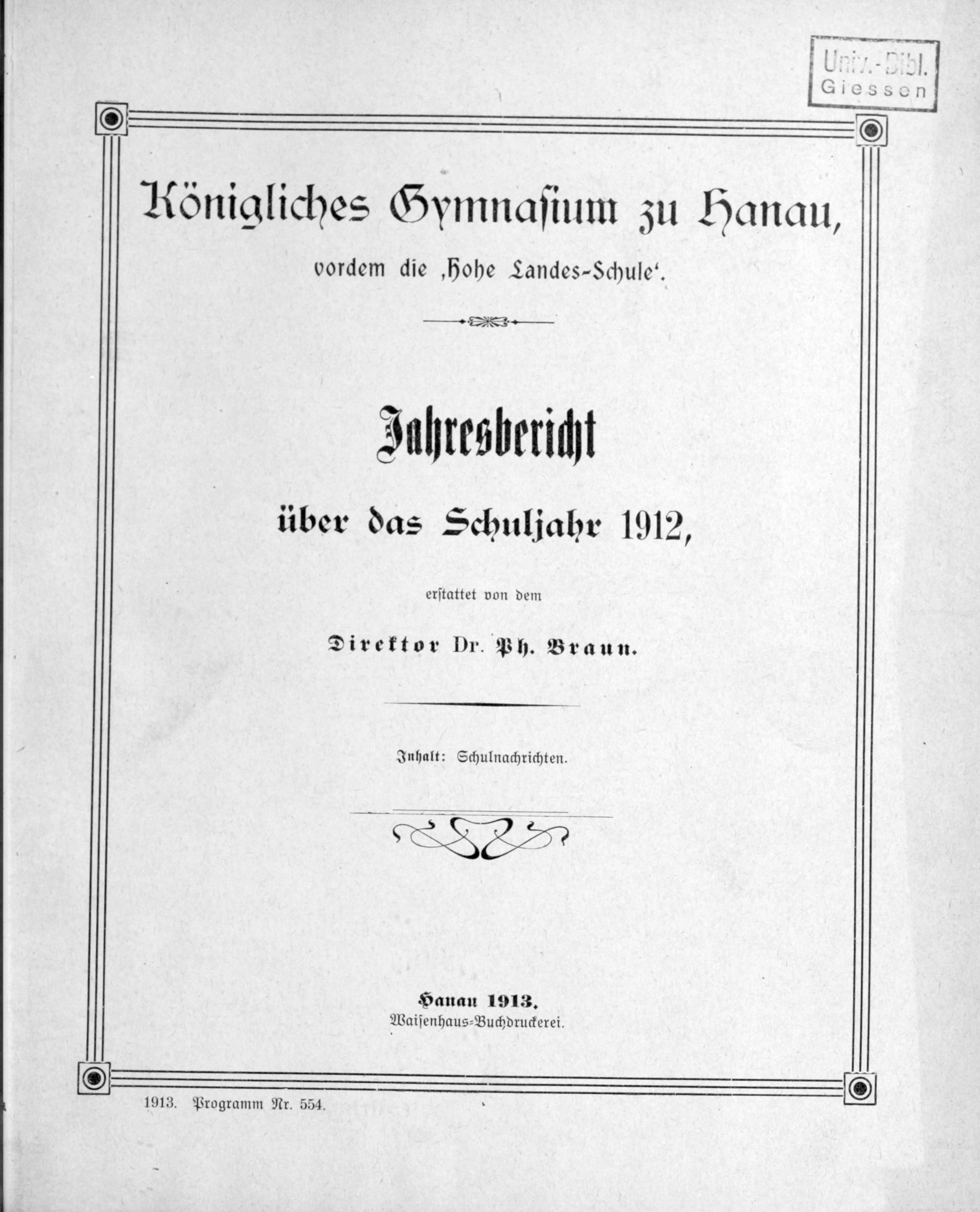 Königliches Gymnasium zu Hanau, vordem "Hohe Landesschule". Festschrift zur Gedenkfeier des 300jährigen Bestehens der Anstalt. 1607-1907