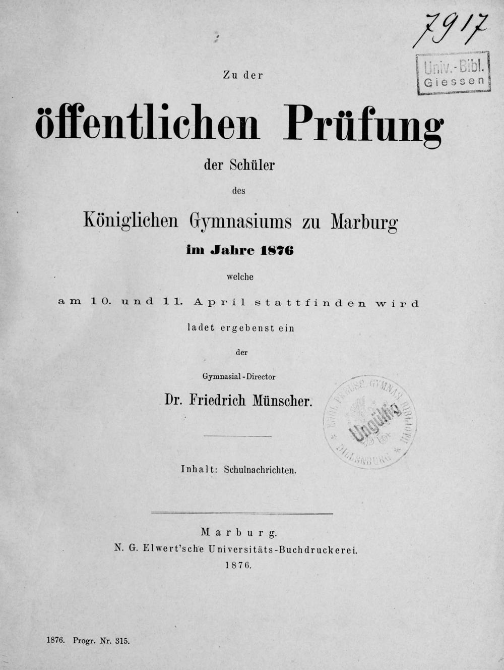 Zu der öffentlichen Prüfung der Schüler des Königlichen Gymnasiums zu Marburg ... ladet ... ein