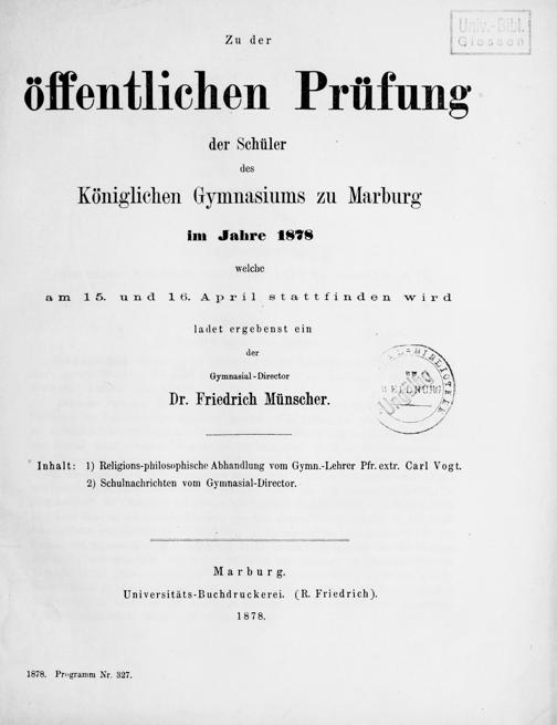 Zu der öffentlichen Prüfung der Schüler des Königlichen Gymnasiums zu Marburg ... ladet ... ein