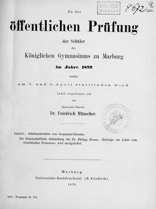 Zu der öffentlichen Prüfung der Schüler des Königlichen Gymnasiums zu Marburg ... ladet ... ein