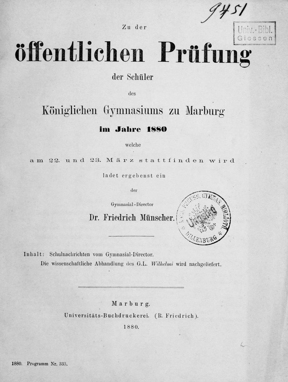 Zu der öffentlichen Prüfung der Schüler des Königlichen Gymnasiums zu Marburg ... ladet ... ein