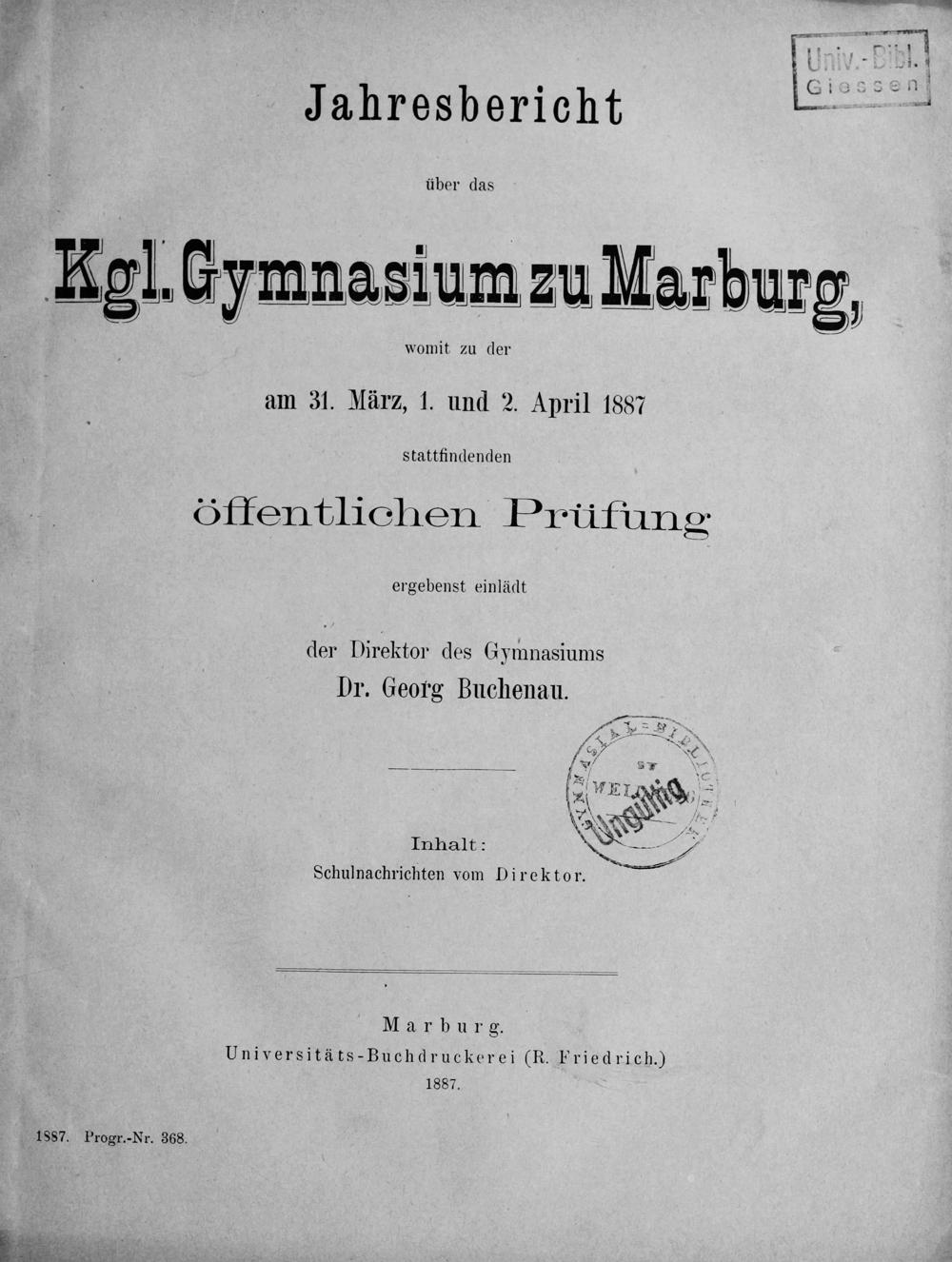 Jahresbericht des Königlichen Gymnasiums zu Marburg