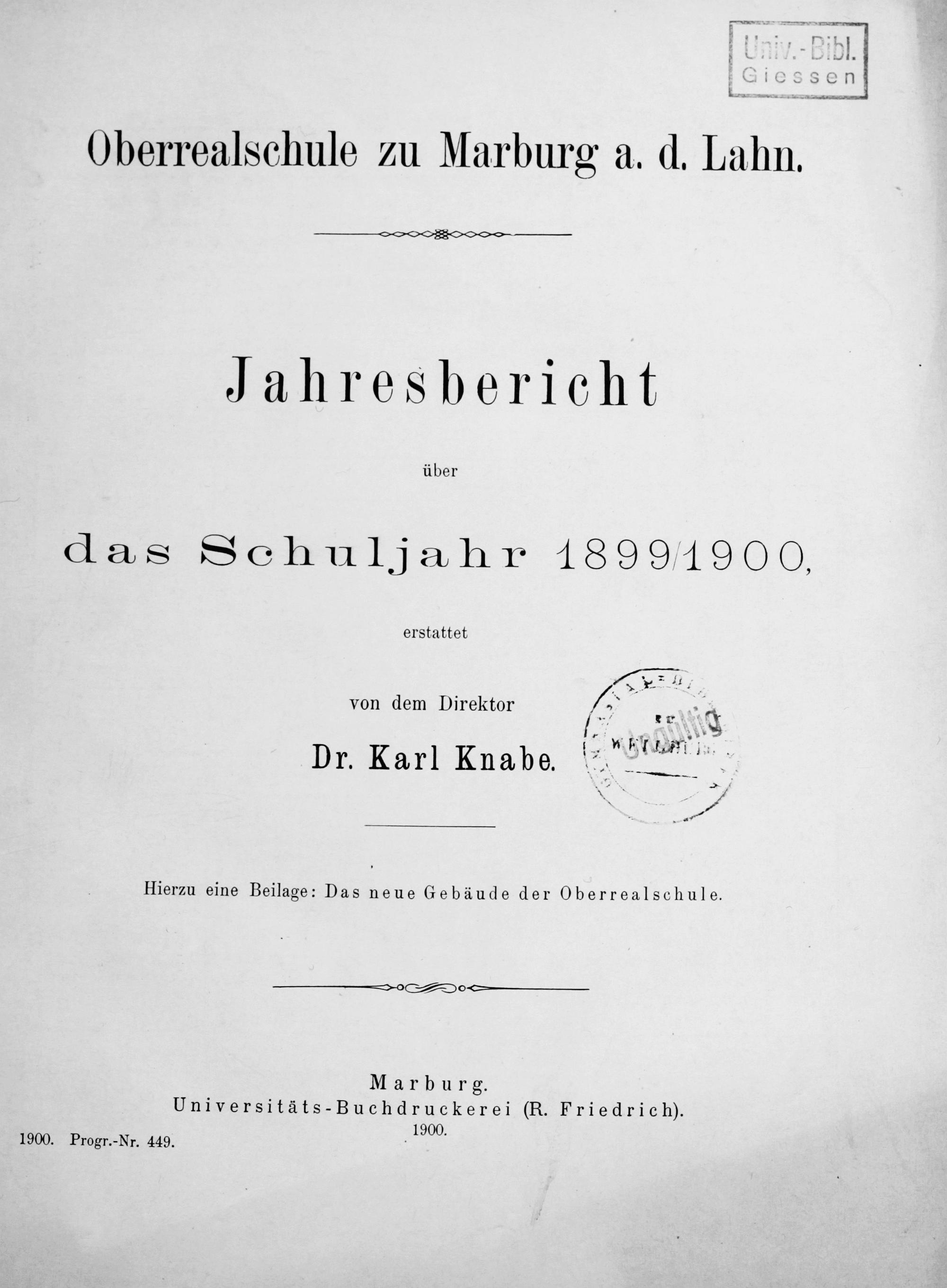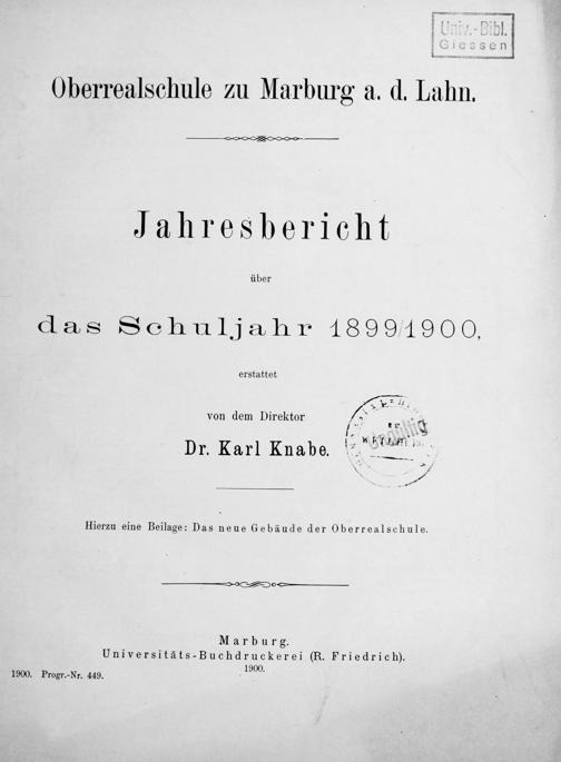 Festschrift zur Einweihungs-Feier des neuen Gebäudes für die Oberrealschule Marburg a. d. Lahn