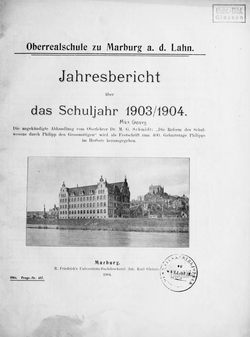 Festschrift zur Einweihungs-Feier des neuen Gebäudes für die Oberrealschule Marburg a. d. Lahn