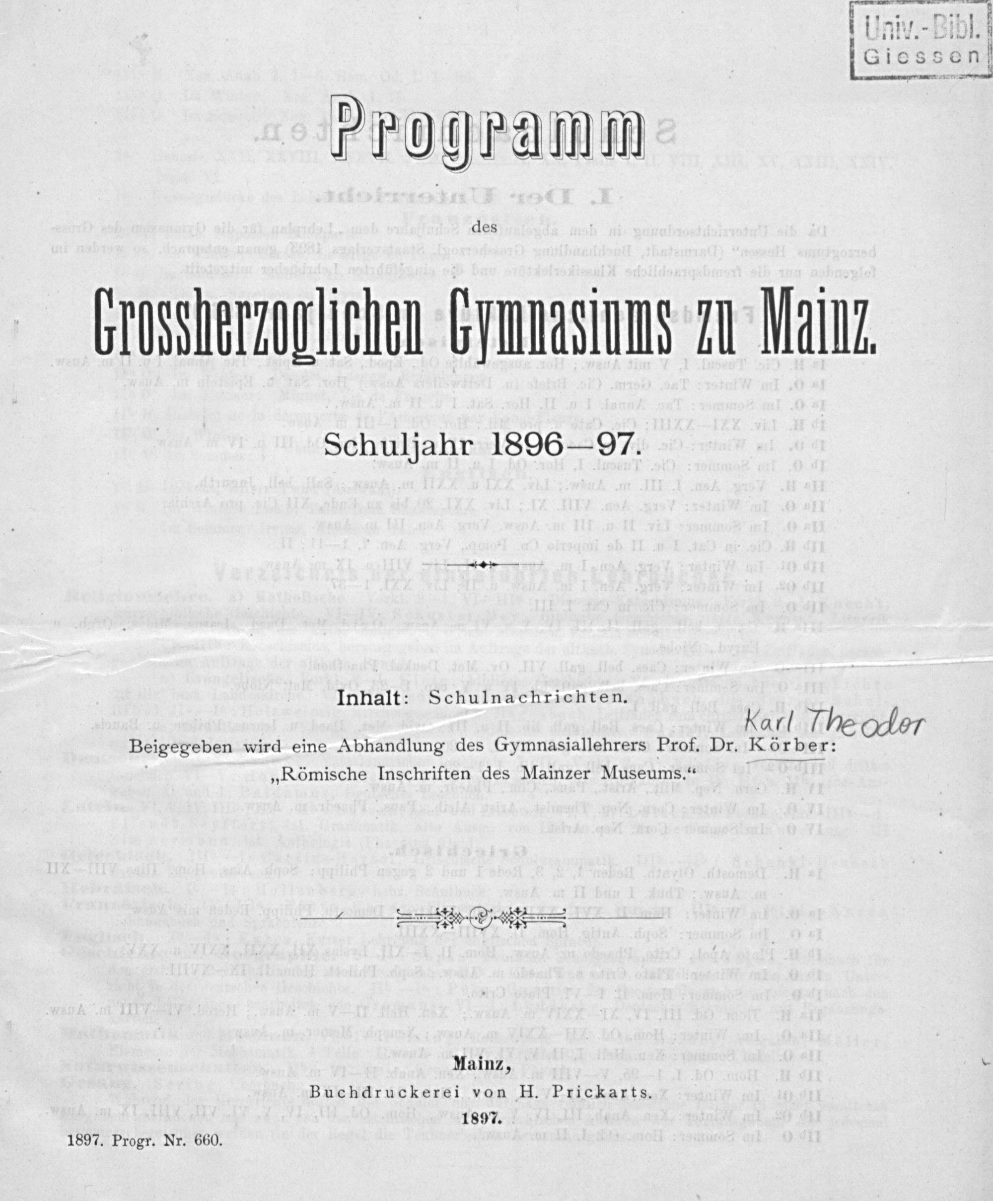 Programm des Großherzoglichen Gymnasiums zu Mainz