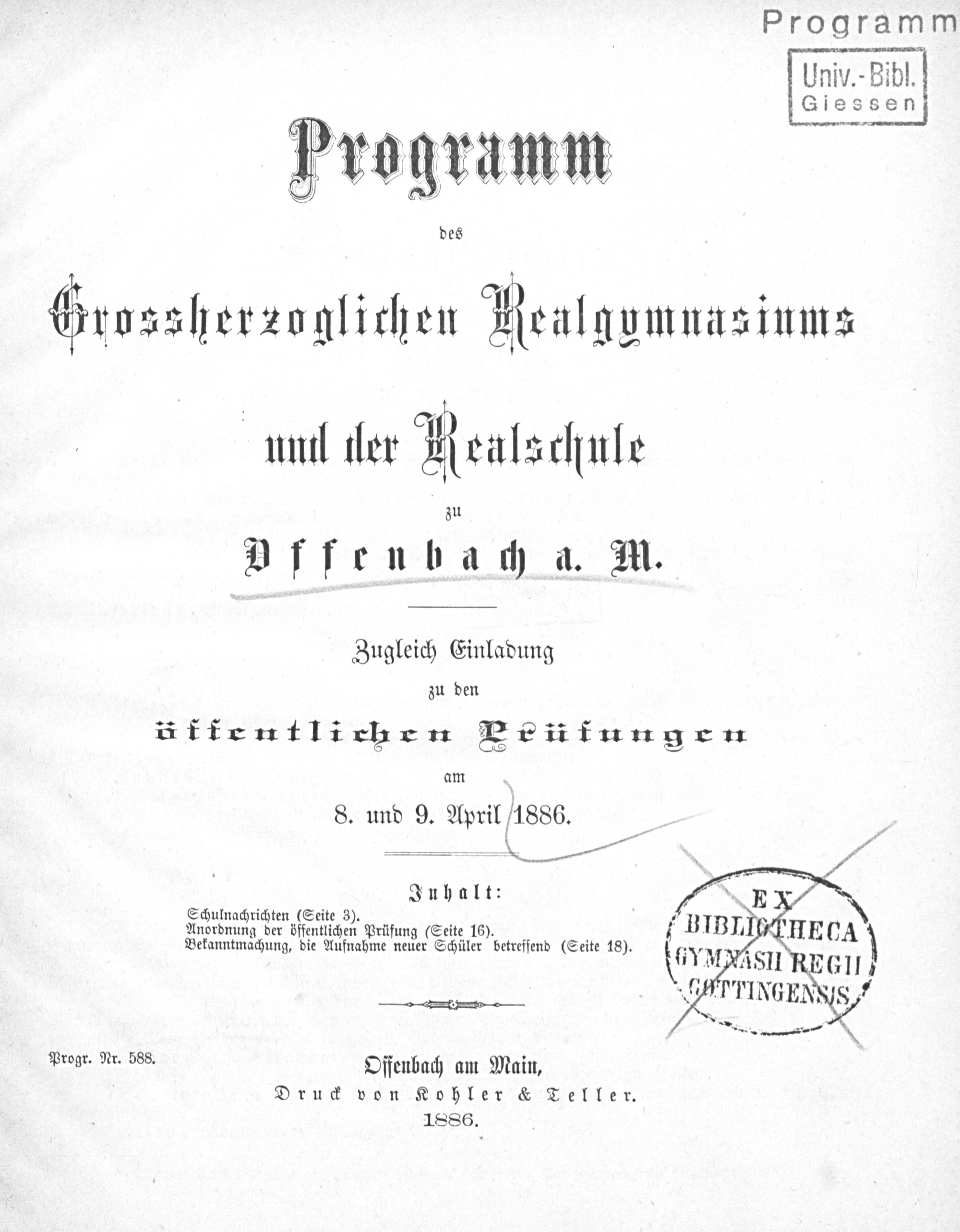 Programm des Grossherzoglichen Realgymnasiums und der Realschule zu Offenbach a. M.
