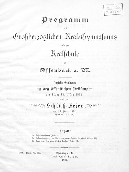 Programm des Grossherzoglichen Realgymnasiums und der Realschule zu Offenbach a. M.