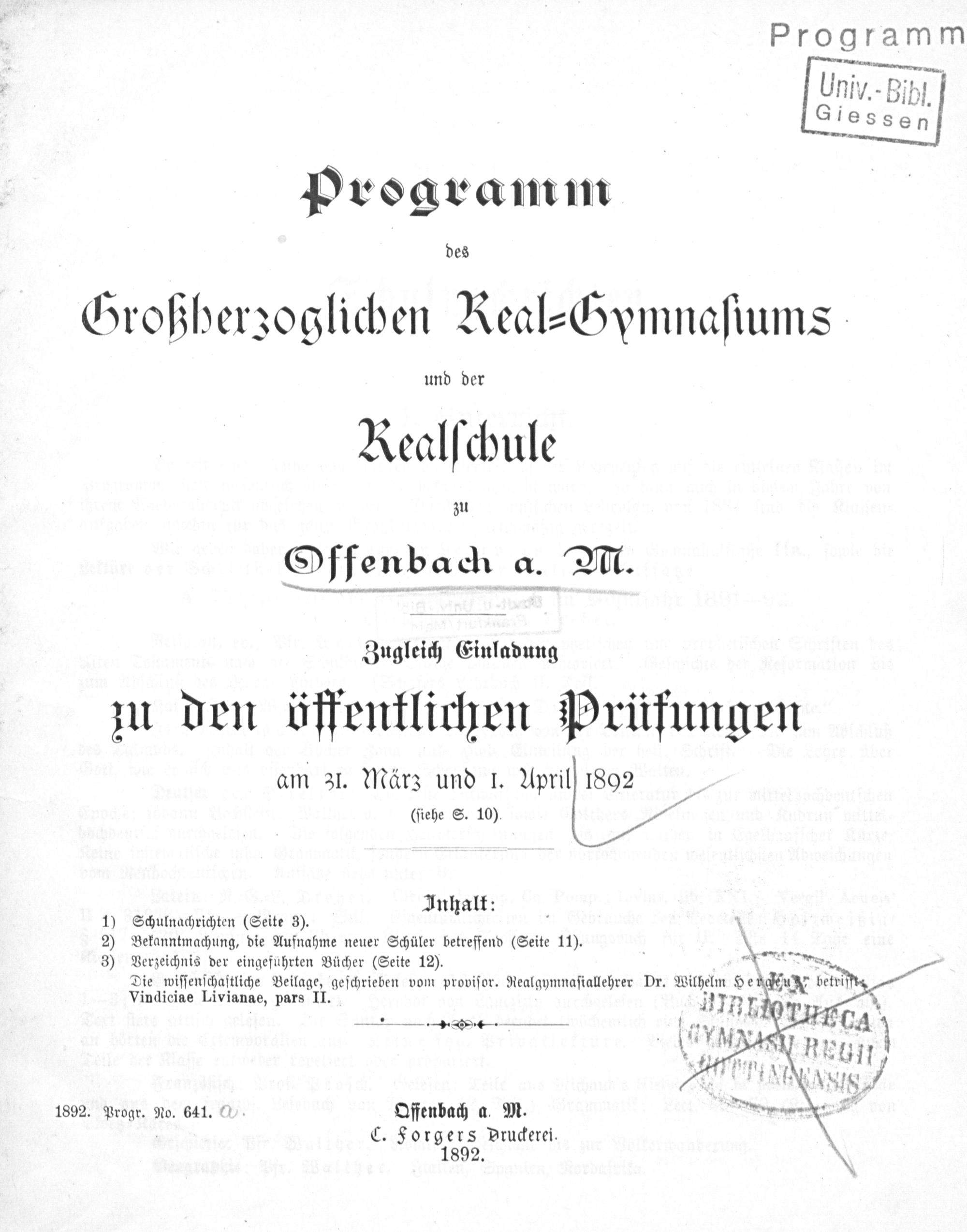 Programm des Grossherzoglichen Realgymnasiums und der Realschule zu Offenbach a. M.