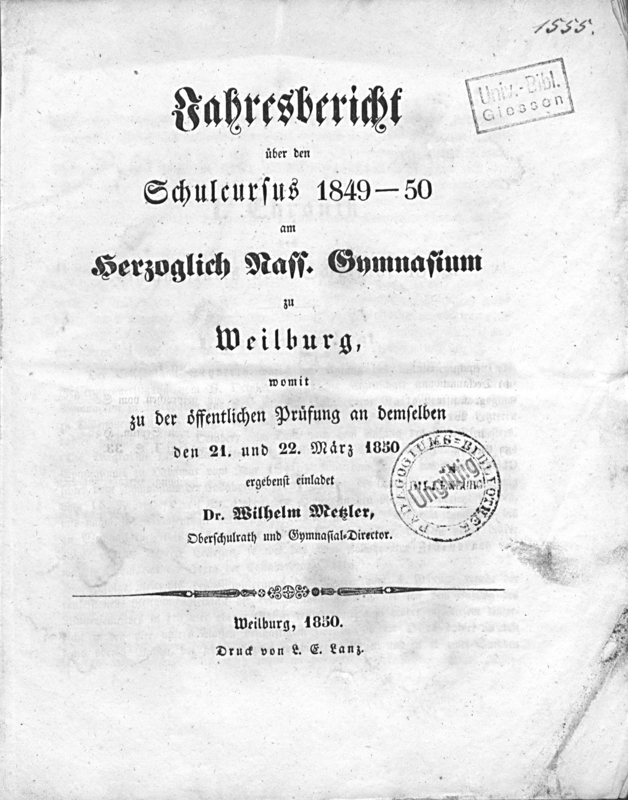 Jahresbericht über den Schulcursus ... am Herzoglich-Nass. Gymnasium zu Weilburg