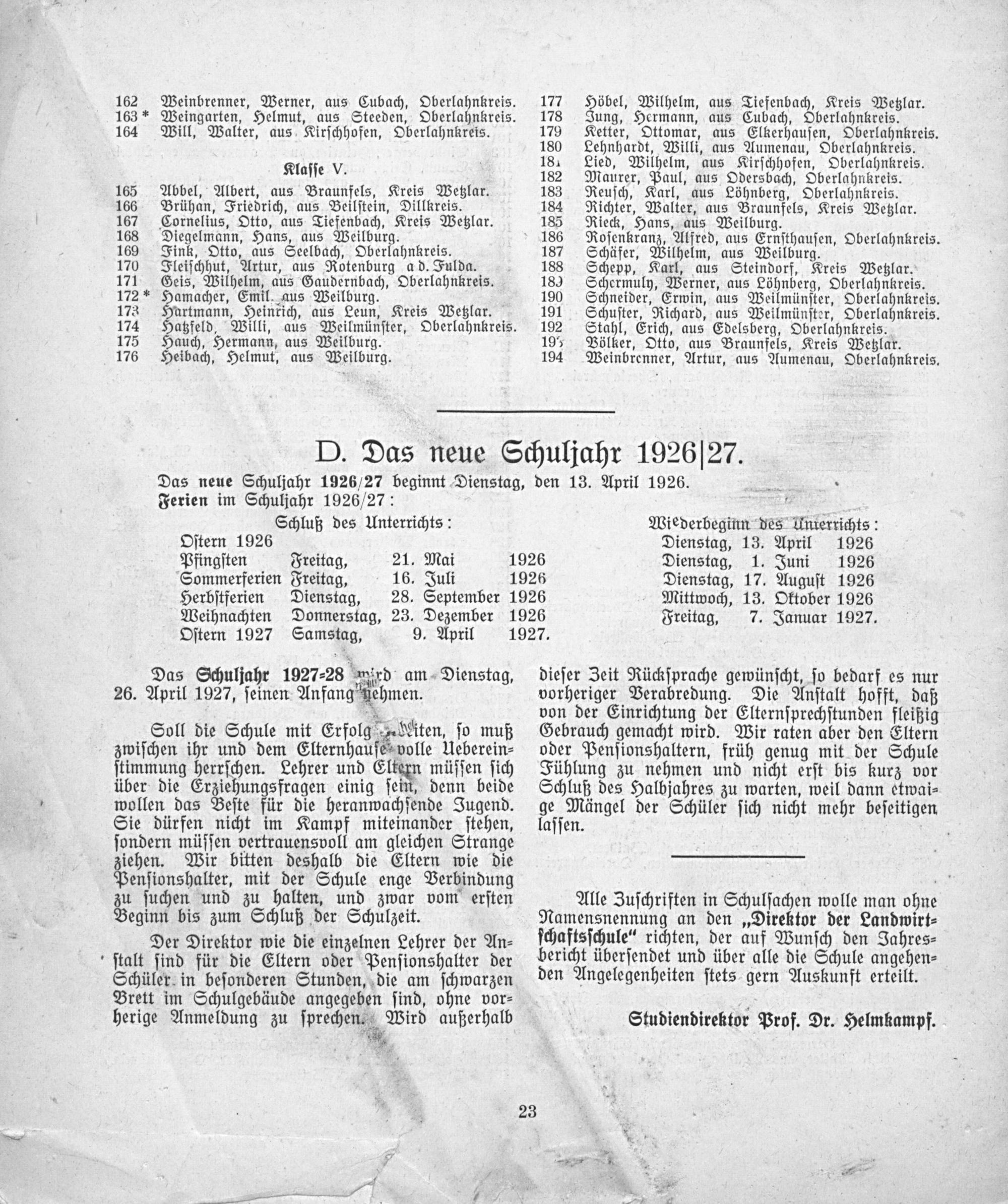 Jahresbericht der Landwirtschaftsschule zu Weilburg a. d. Lahn