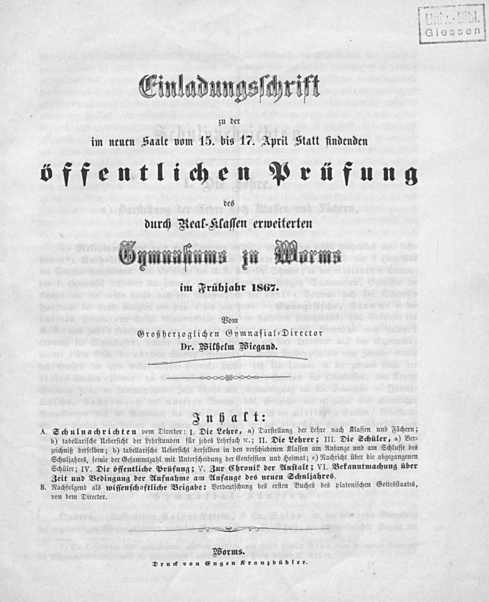 Einladungsschrift zu der vom ... bis ... statt findenden öffentlichen Prüfung des Durch Real-Klassen Erweiterten Gymnasiums zu Worms im Frühjahr ...