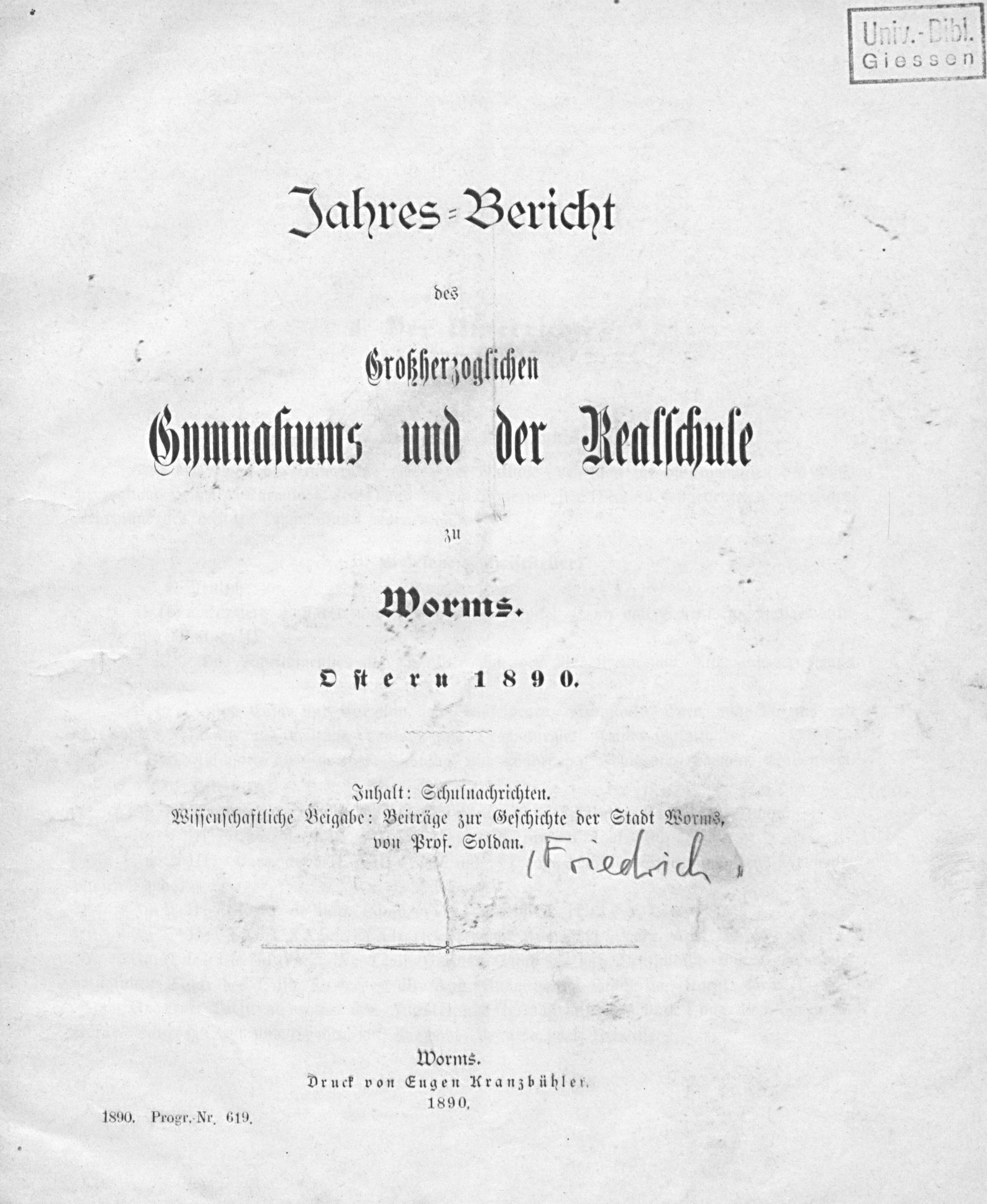 Jahresbericht des Großherzoglichen Gymnasiums und der Großherzoglichen Realschule zu Worms