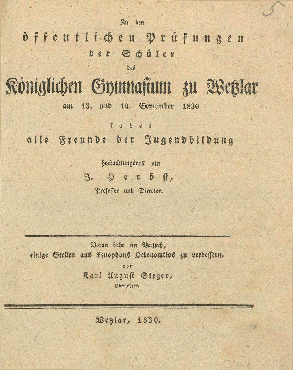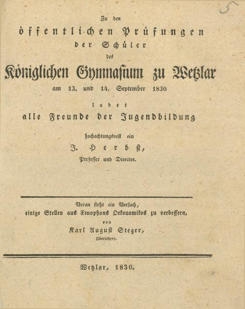 Zu den öffentlichen Prüfungen und Redeübungen der Schüler des Königlichen Gymnasiums zu Wetzlar ... ladet ... hochachtungsvoll ein die Direction