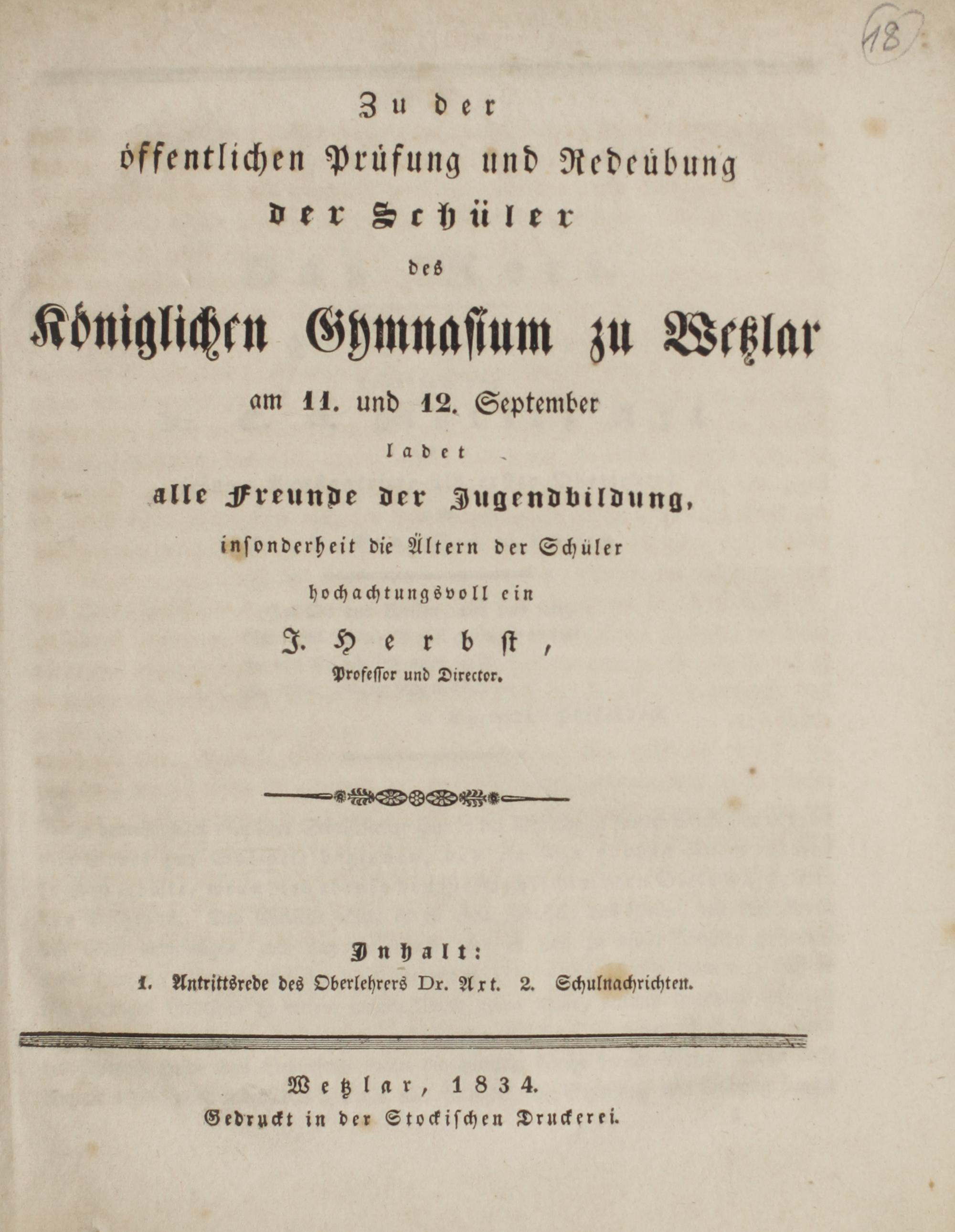 Zu den öffentlichen Prüfungen und Redeübungen der Schüler des Königlichen Gymnasiums zu Wetzlar ... ladet ... hochachtungsvoll ein die Direction