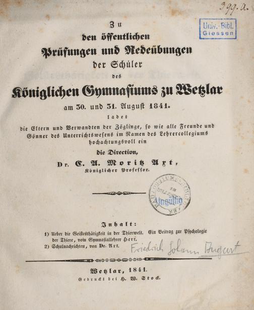 Zu den öffentlichen Prüfungen und Redeübungen der Schüler des Königlichen Gymnasiums zu Wetzlar ... ladet ... hochachtungsvoll ein die Direction