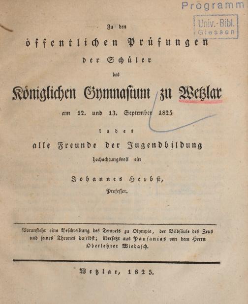 Zu den öffentlichen Prüfungen und Redeübungen der Schüler des Königlichen Gymnasiums zu Wetzlar ... ladet ... hochachtungsvoll ein die Direction