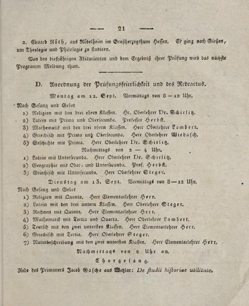 Zu den öffentlichen Prüfungen und Redeübungen der Schüler des Königlichen Gymnasiums zu Wetzlar ... ladet ... hochachtungsvoll ein die Direction