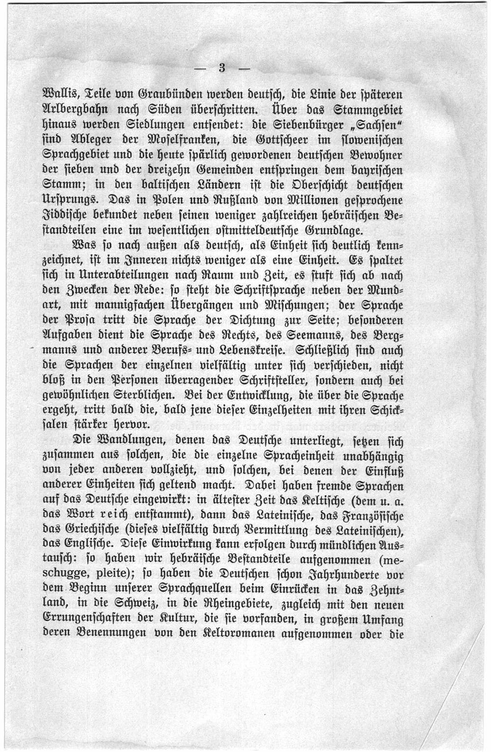 Was so nach außen als deutsch, als Einheit sich deutlich kennzeichnet, ist im Inneren nichts weniger als eine Einheit. Es spaltet ſich in Unterabteilungen nach Raum und Zeit, es ſtuft sich ab nach den Zwecken der Rede: so steht die Schriftsprache neben der Mundart, mit mannigfachen Übergängen und Mischungen; der Sprache der Prosa tritt die Sprache der Dichtung zur Seite; besonderen Aufgaben dient die Sprache des Rechts, des Seemanns, des Bergmanns und anderer Berufs- und Lebenskreise. Schließlich sind auch die Sprachen der einzelnen vielfältig unter sich verschieden, nicht bloß in den Personen überragender Schriftsteller, sondern auch bei gewöhnlichen Sterblichen. Bei der Entwicklung, die über die Sprache ergeht, tritt bald die, bald jene dieser Einzelheiten mit ihren Schicksalen stärker hervor.