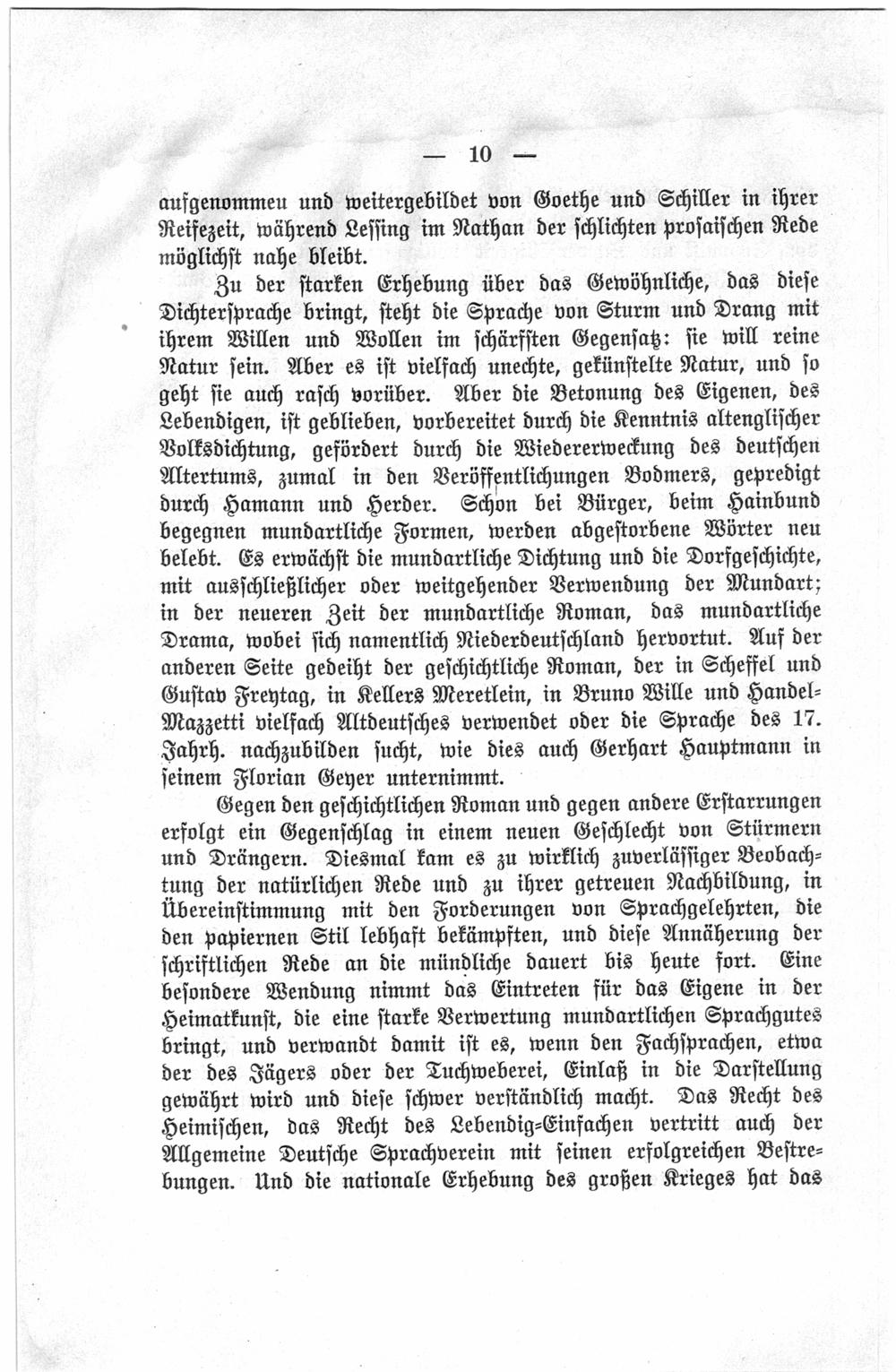 Zu der starken Erhebung über das Gewöhnliche, das diese Dichtersprache bringt, steht die Sprache von Sturm und Drang mit ihrem Willen und Wollen im schärfsten Gegensaz: sie will reine Natur sein. Aber es ist vielfach unechte, gekünstelte Natur, und so geht sie auch rasch vorüber. Aber die Betonung des Eigenen, des Lebendigen, ist geblieben, vorbereitet durch die Kenntnis altenglischer Volksdichtung, gefördert durch die Wiedererweckung des deutschen Altertums, zumal in den Veröffentlichungen Bodmers, gepredigt durch Hamann und Herder. Schon bei Bürger, beim Hainbund begegnen mundartliche Formen, werden abgestorbene Wörter neu belebt. Es erwächst die mundartliche Dichtung und die Dorfgeschichte, mit ausschließlicher oder weitgehender Verwendung der Mundart; in der neueren Zeit der mundartliche Roman, das mundartliche Drama, wobei sich namentlich Niederdeutschland hervortut. Auf der anderen Seite gedeiht der geschichtliche Roman, der in Scheffel und Gustav Freytag, in Kellers Meretlein, in Bruno Wille und HandelMazzetti vielfach Altdeutsches verwendet oder die Sprache des 17. Jahrh. nachzubilden sucht, wie dies auch Gerhart Hauptmann in seinem Florian Geyer unternimmt.