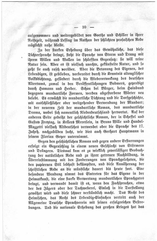 Gegen den geschichtlichen Roman und gegen andere Erstarrungen erfolgt ein Gegenschlag in einem neuen Geschlecht von Stürmern und Drängern. Diesmal kam es zu wirklich zuverlässiger Beobachtung der natürlichen Rede und zu ihrer getreuen Nachbildung, in Übereinstimmung mit den Forderungen von Sprachgelehrten, die den papiernen Stil lebhaft bekämpften, und diese Annäherung der schriftlichen Rede an die mündliche dauert bis heute fort. Eine besondere Wendung nimmt das Eintreten für das Eigene in der Heimatkunst, die eine starke Verwertung mundartlichen Sprachgutes bringt, und verwandt damit ist es, wenn den Fachsprachen, etwa der des Jägers oder der Tuchweberei, Einlaß in die Darstellung gewährt wird und diese schwer verständlich macht. Das Recht des Heimischen, das Recht des Lebendig- Einfachen vertritt auch der Allgemeine Deutsche Sprachverein mit seinen erfolgreichen Bestrebungen. Und die nationale Erhebung des großen Krieges hat das