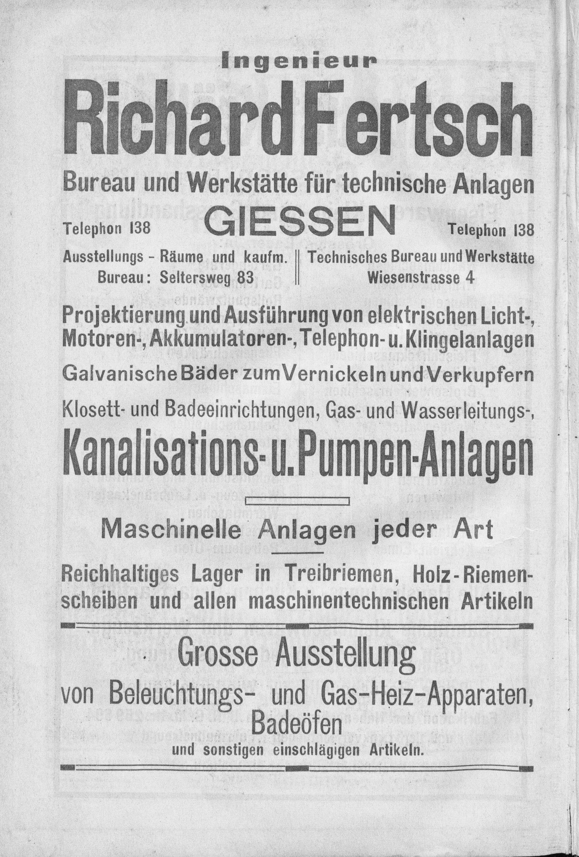 Ausstellungs— Räume und kaufm. Technisches Bureau und Werkstätte Bureau: Seltersweg 83 Wiesenstrasse 4