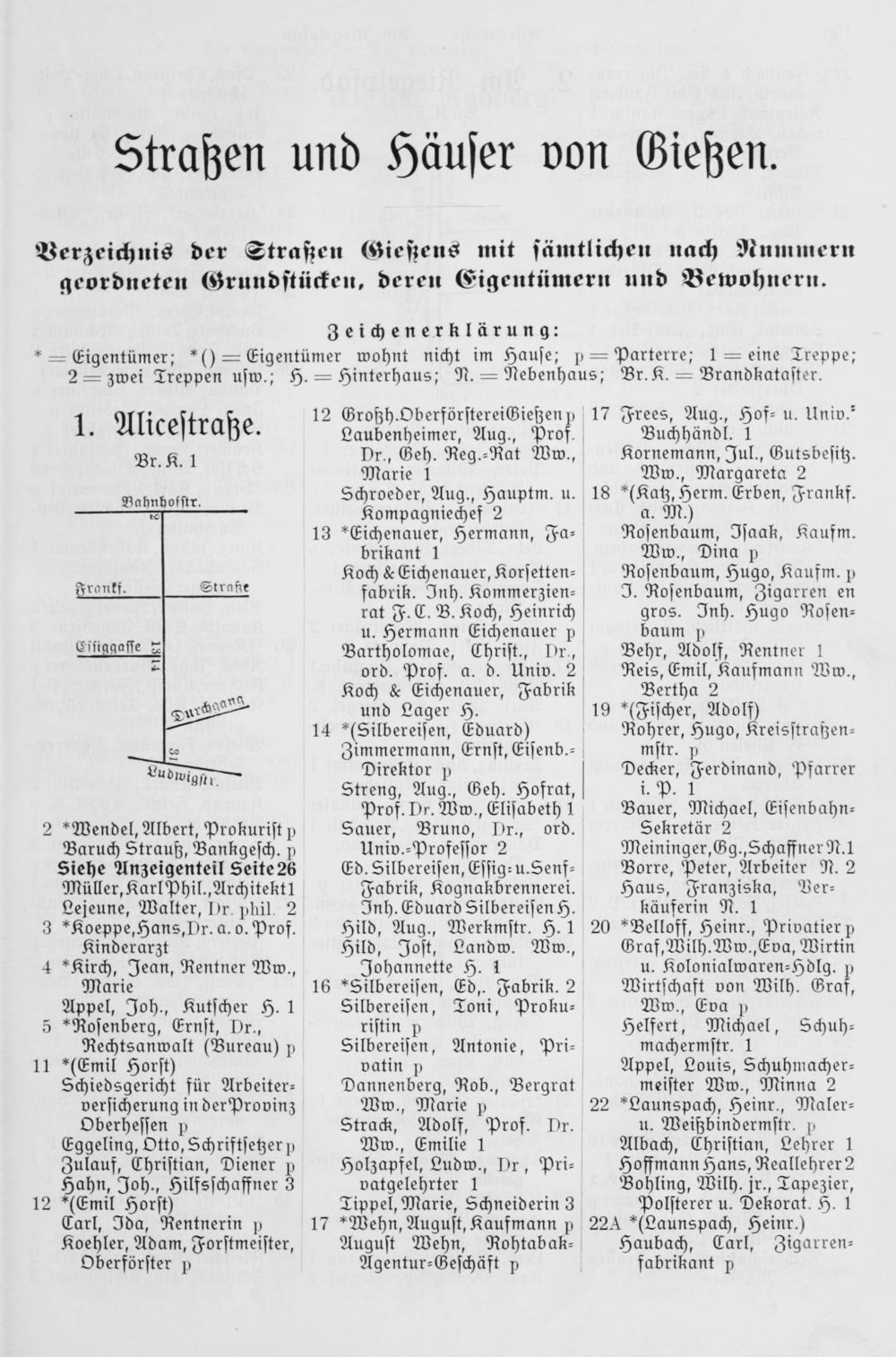 Verzeichnis der Straßen Gießens mit sämtlichen nach Naummern geordneten Grundstücken, deren Eigentümern und Bewohnern.