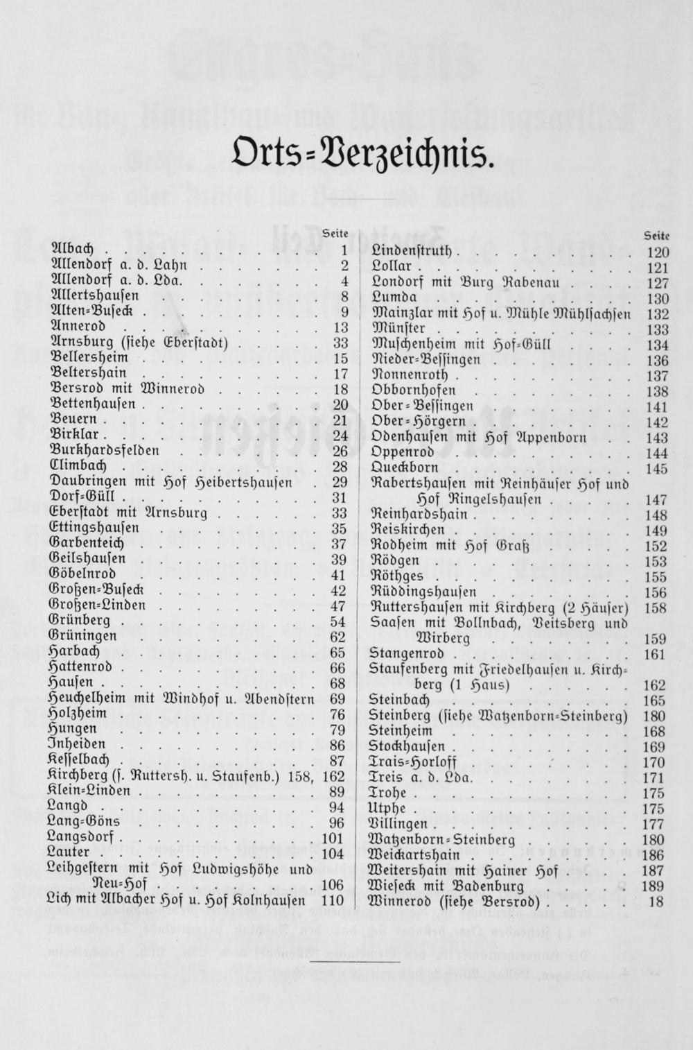 Seite Albach 1 Allendorf a. d. Lahn 2 Allendorf&. d. Sd.. 4 Allertsbhausenn 38 Alten⸗Busert 9 Annerds 133 Arnsburg(siehe 33 Bellersheim— 15 Beltershain 17 Bersrod mit Winnerod 18 Bettenhausen. 20 Beuern 21 Birklar 24 Burkhardsfelden 26 Climbach 28 Daubringen mit Hof Heibertshaufen 2 Dorf-Güll. 351 Eberstadt mit Arnsburg 3 Ettingshausen 35⁵ Garbenteich 37 Geilshausen 39 Göbelnrod. 41 Großen-Busech 42 Großen-Linden 47 Grünberg. 54 Grüningen 62 Harbach 65⁵ Hattenrod. 66 Hausen. Heuchelheim mit windhaf u. uwerosten 69 Holzheim 76 Hungen 79 Inheiden 86 Kesselbach 87